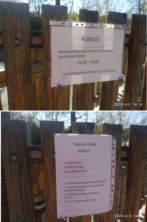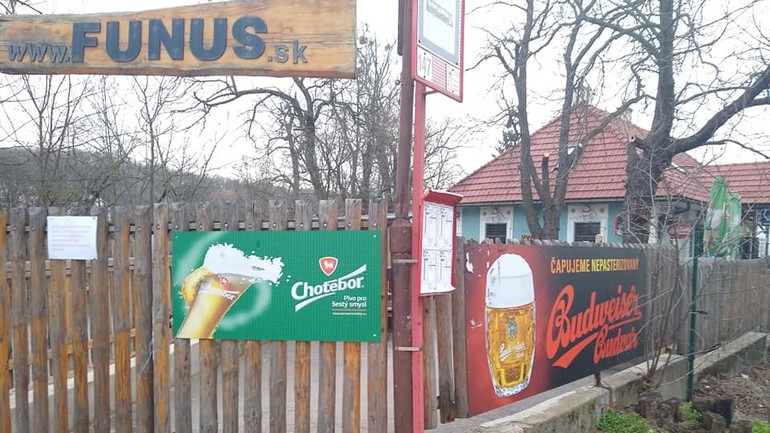 Obe brány do podniku boli otvorené a na jednom z nich bol oznam, že podľa povolenia hlavného hygienika je vo Funuse povolený v čase od 10 do 19 hodiny ambulantný predaj a rozvoz jedál. V praxi to znamená, že si môžete objednať to, na čo máte chuť cez okienko, ale konzumovať to v priestoroch krčmy povolené nie je. Teda, ak máte naozaj nesmiernu chuť na pivo či kofolu, tak vám tieto nápoje načapujú do plastových pohárov, ale potom by ste mali terasu opustiť.