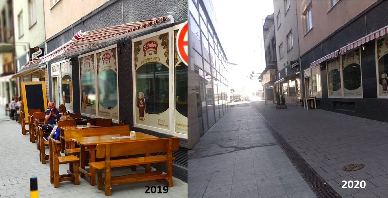 Stoly na terase sú obohnané červenobielou páskou, aby nikoho ani len nenapadlo si k niektorému sadnúť, a tak sa stojí s pivom v ruke priamo na ulici Prokopa Veľkého. Prípadne sedí na schodoch vedúcich k neďalekému kostolu na Kalvárii.