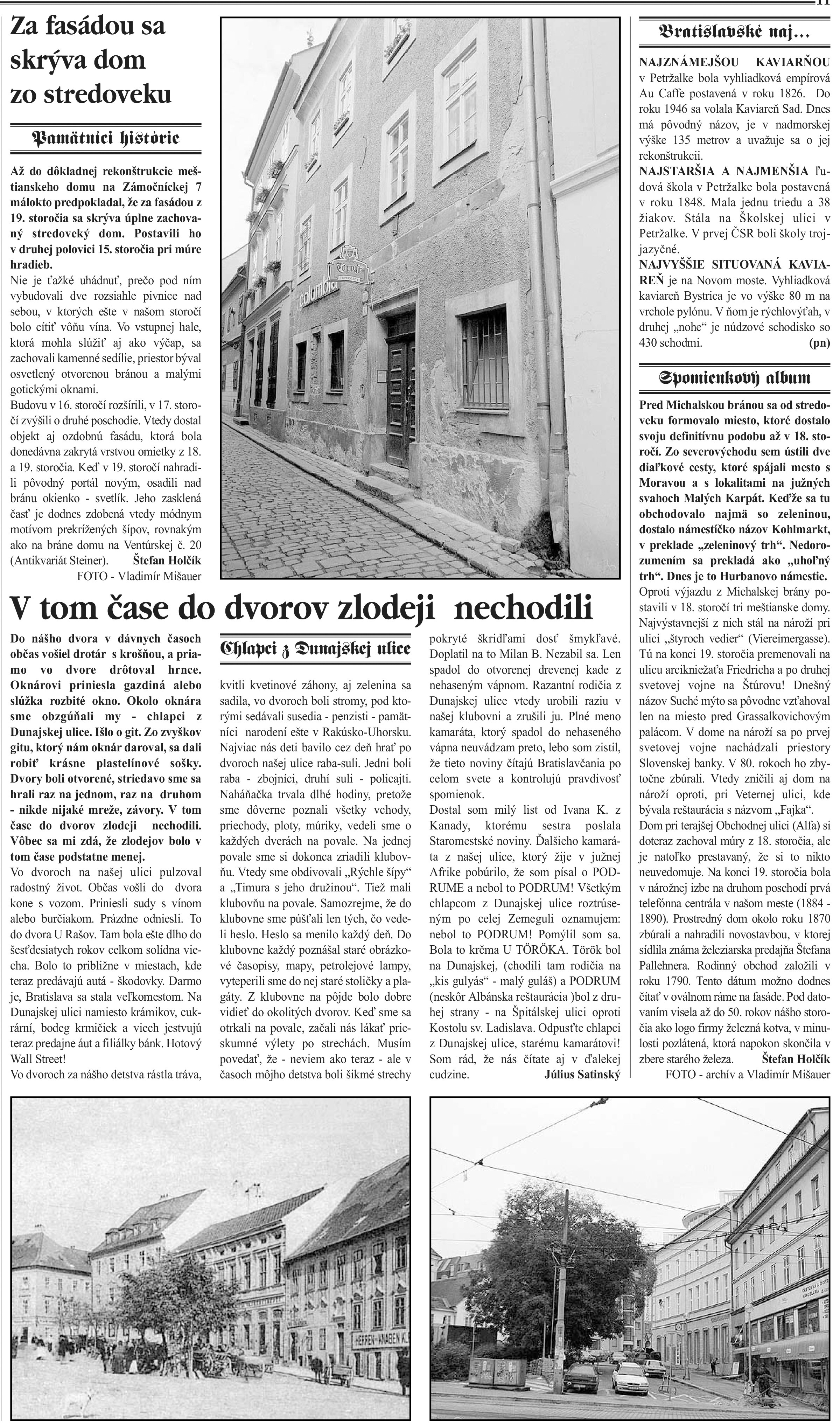 V našej rubrike NAŠA HISTÓRIA si totiž okrem dejín Bratislavy môžete s nami pripomenúť i staršie články z Bratislavských novín, ktoré píšu svoj moderný príbeh už od roku 1998 a majú už taktiež svoje dejiny. Dnes si pripomenieme nielen chlapcov z Dunajskej ulice, ale aj zaujímavosti o dvoch miestach, ktoré dobre poznáte....