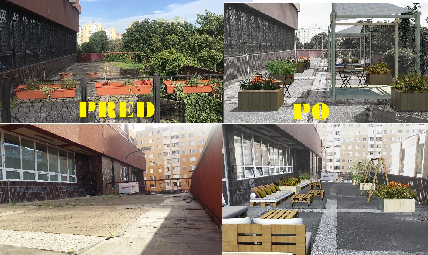 Zadná terasa sa nachádza pri Centre Svetielko, ktoré sa venuje deťom s viacnásobným postihnutím. Polovicu sumy z grantu investujú aktivisti na paletové sedenie, kvetináče a hojdačku. „Zútulníme tento priestor tak, aby sa deti mohli hrať aj na terase.“