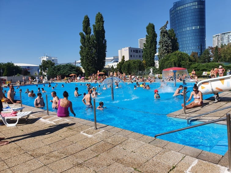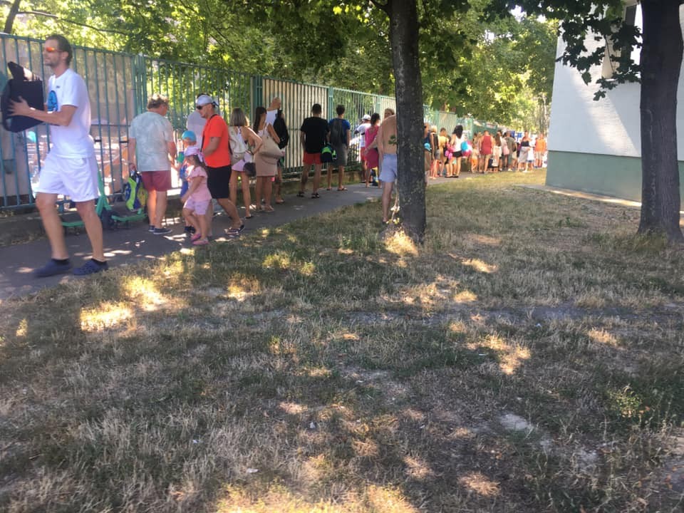 Na letnom kúpalisku Tehelné pole je dlhodobo otvorená pri vstupe len jedna pokladňa, takže kto sa chcel včera okúpať, tak musel najskôr vystáť takýto rad...