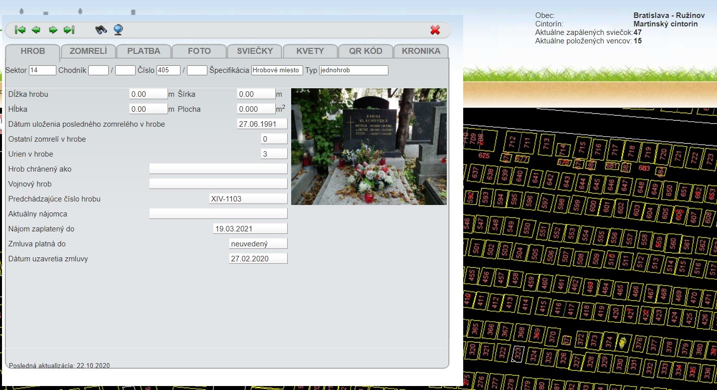 Na pravej strane sa nachádza tabuľka, vďaka ktorej môžete zistiť či sa v databáze nachádza cintorín, kde by mal byť váš blízky človek pochovaný a hneď pod ňou je aj druhý spôsob vyhľadávania, kde stačí zadať mesto, meno a priezvisko zosnulej osoby. Následne vám systém ukáže nielen to, na ktorom cintoríne sa nachádza, ale aj presnú polohu hrobového či urnového miesta a to dokonca aj na mapke a zároveň vám vypíše dátum narodenia a úmrtia, čo sú údaje, ktoré niektorí ľudia občas aj zabudnú. Takisto môžete zistiť či bolo hrobové miesto zaplatené a dokedy. Aj táto informácia sa mnohým určite zíde, pretože nie je príjemné, keď sa vyberiete cez "Dušičky" na hroby blízkych a nájdete tam nálepku alebo inú formu upozornenia, že prenájom hrobu zaplatený nebol.