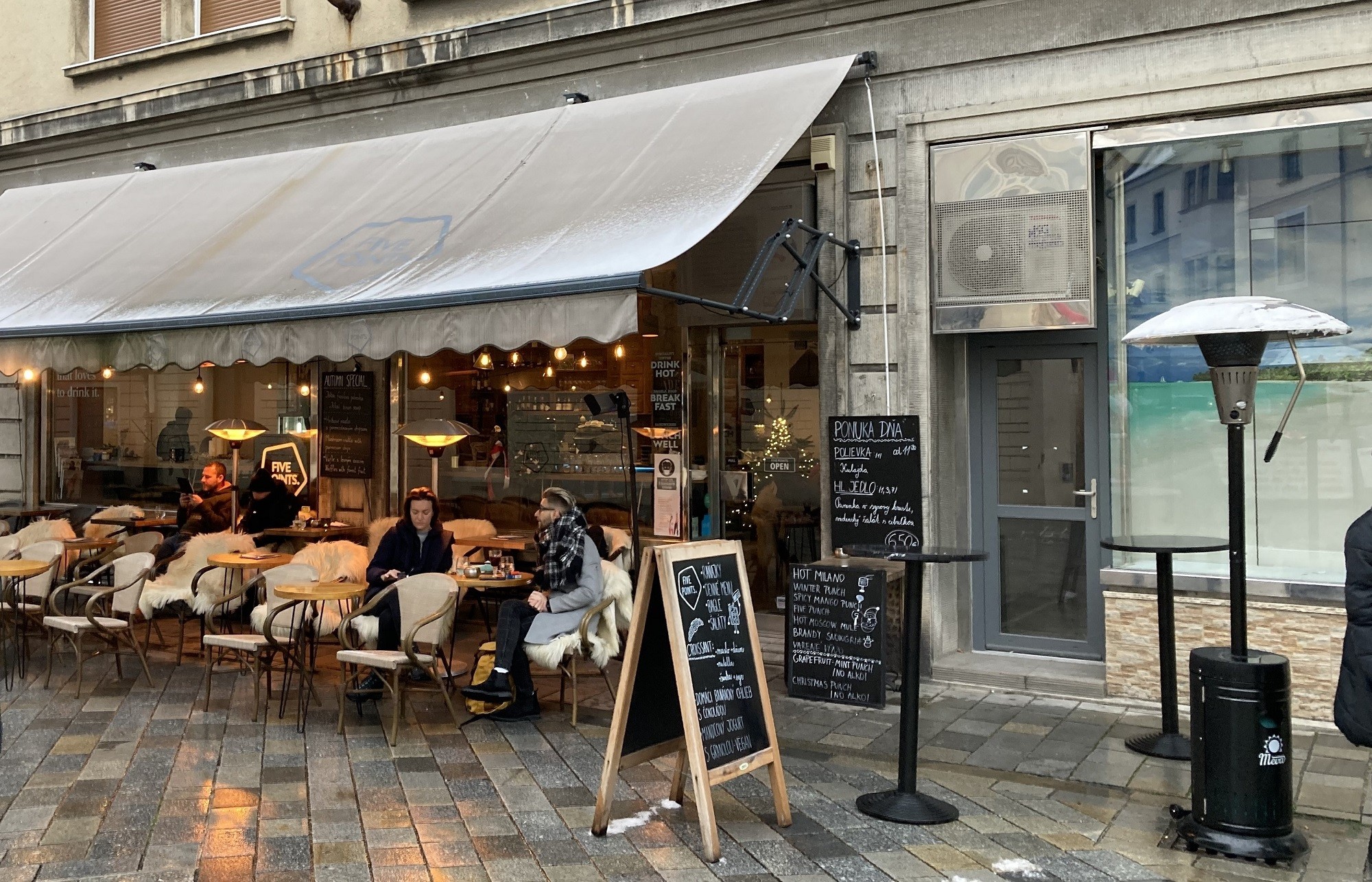 Z námestia sme sa presunuli na zastávku Kávičkárska, do kaviarne s bistro kuchyňou Five Points na Panskej ulici. Okrem kvalitnej kávy a chutného menu (6,50 €) sú v ponuke rôzne vianočné drinky, niektoré s obsahom alkoholu, iné bez: napríklad Winter punch, Hot Milano, Brandy snowgria, varené víno, Christmas punch...