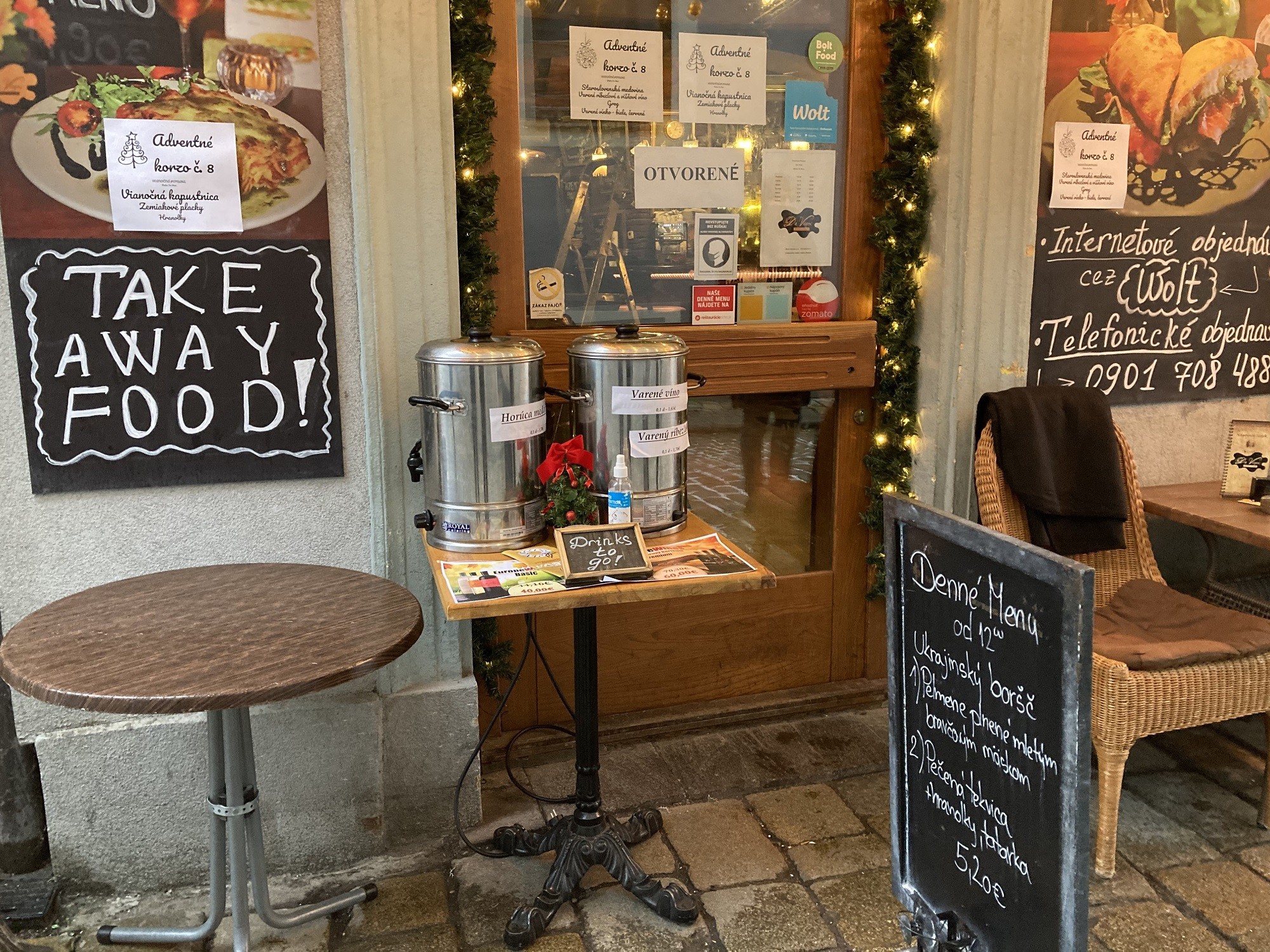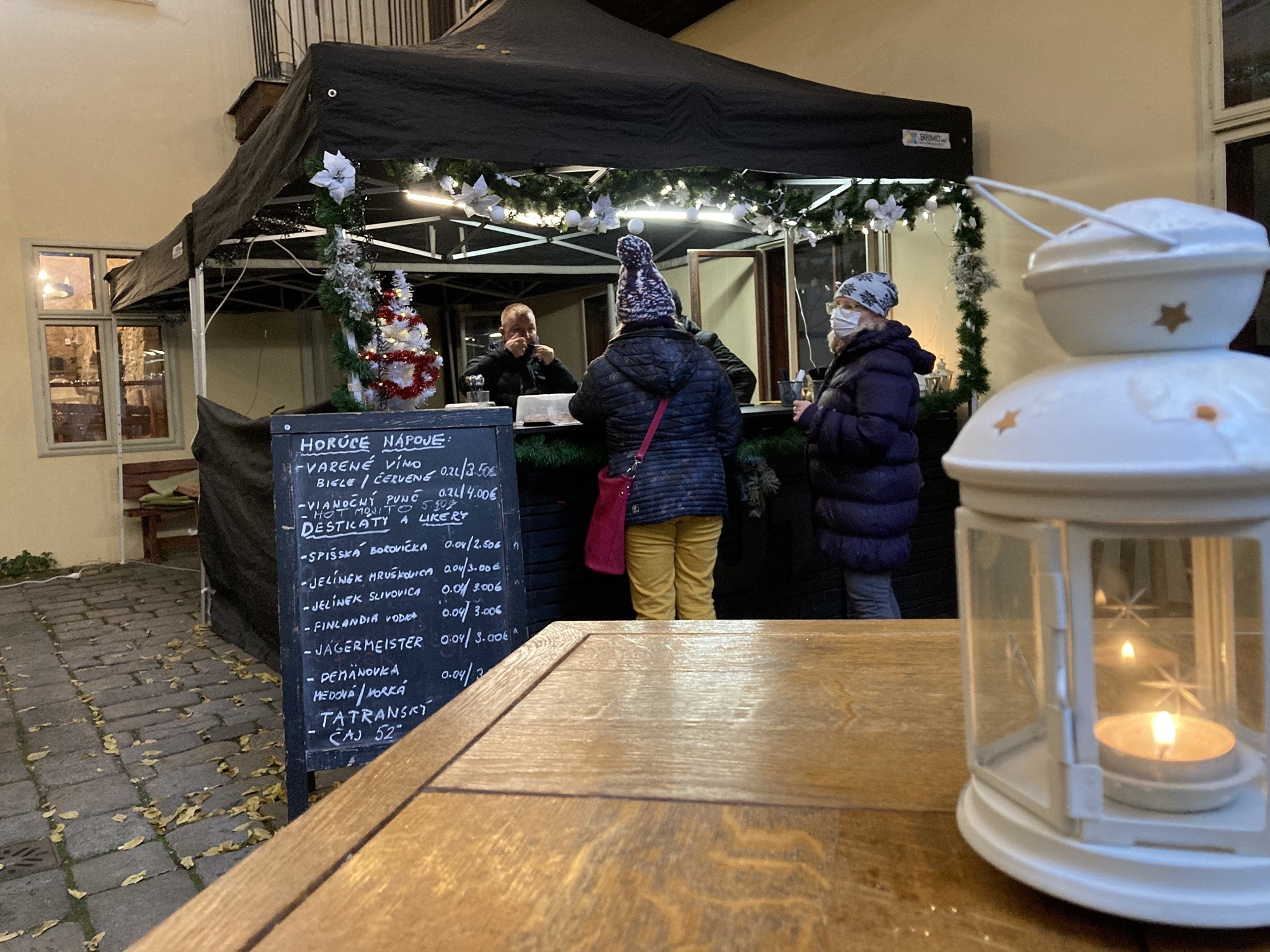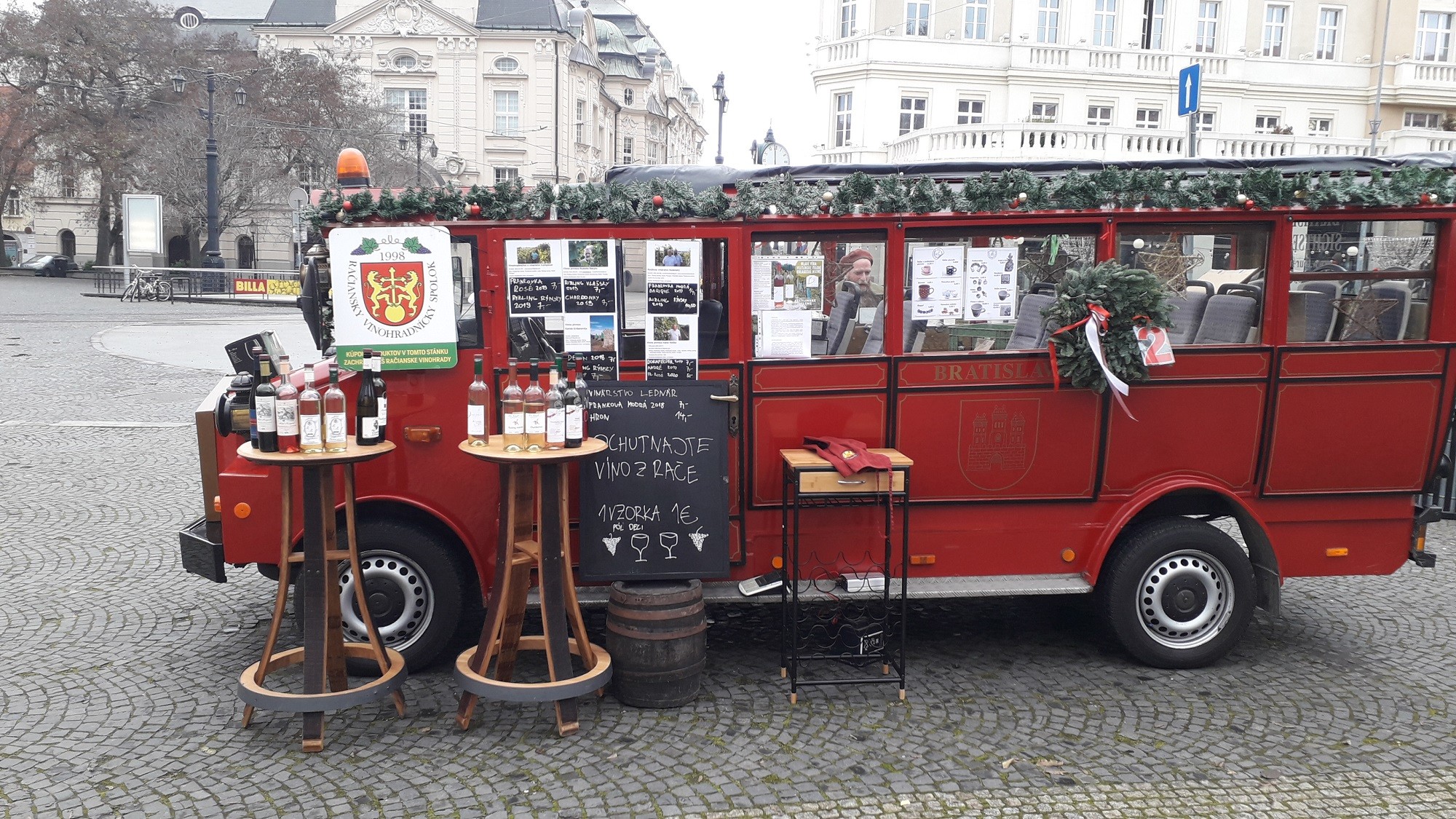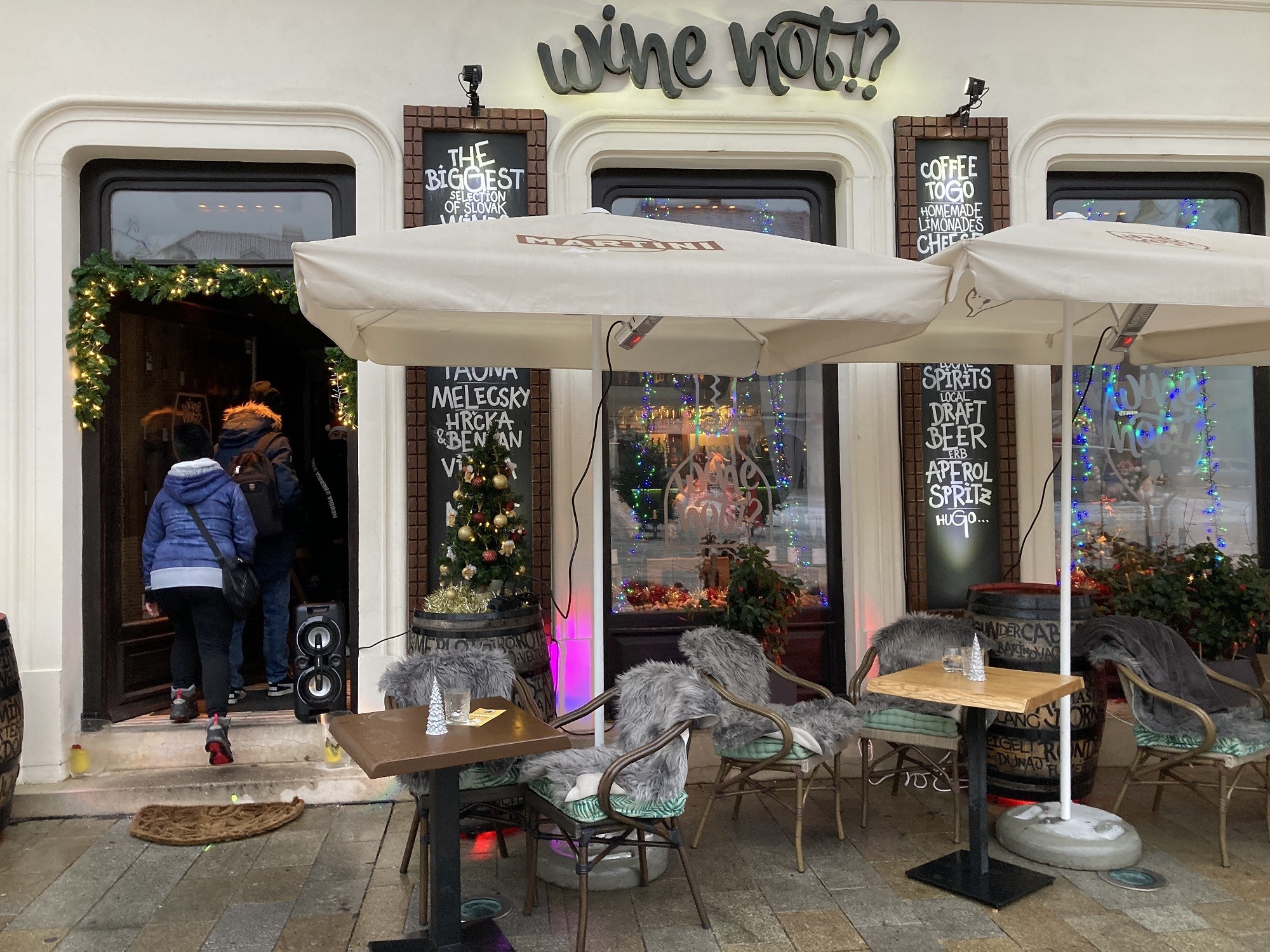 Pár krokov ďalej, na Hlavnom námestí je Vínová zastávka, ako inak, pred vínnym barom Wine not. Na terase s vianočnou atmosférou si môžete dať tradičnú kapustnicu (4,90 €), varené víno (3,50 €) aj varený mušt (3 €), domáce šišky (2,90 €), rôzne chutné koláčiky, ale takisto pivo či kávu.