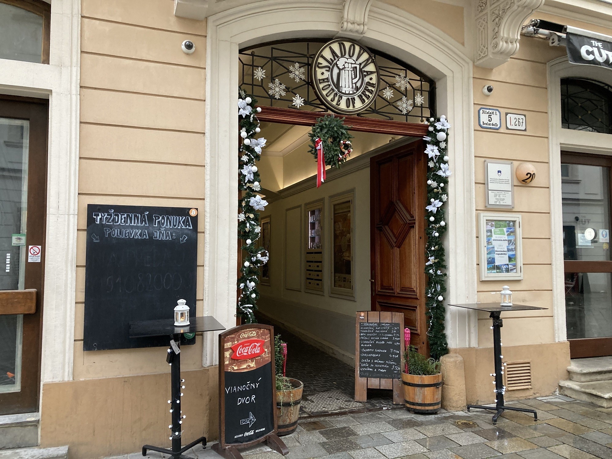 O pár metrov vyššie, na Ventúrskej ulici, je Pivárska zastávka - podnik Sladovňa, ktorý nachystal vianočný dvor s čarovnou atmosférou. Môžete sa zohriať pri varenom vínku (3,50 €), vianočnom punči (4 €), Hot mojite (5,50 €), ale tiež dobre sa najesť. Vo vianočnom menu sú kapustnica (3,20 €) aj tradičná fazuľovica (3,20 €), bryndzové halušky so slaninou (4,90 €), pečená domáca klobása (3,90 €), vianočný pulled pork (6,90 €), lokše s kačacou paštétou (3,50 €), lokše plnené slivkovým lekvárom a makom (3,50 €), aj klasický chlieb s oškvarkovou masťou (1,90 €).