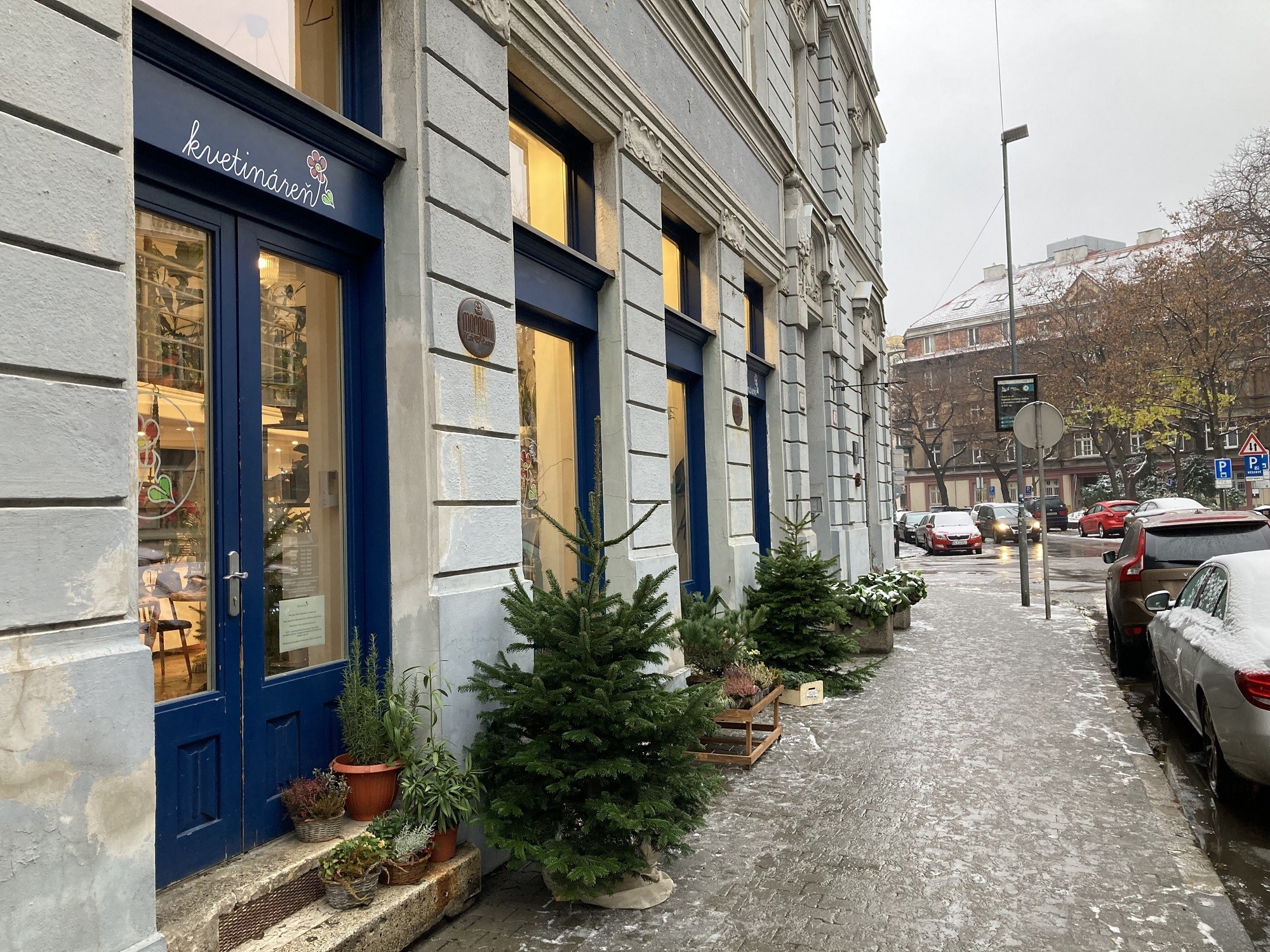 Naša prvá zastávka bola Romantická. Je to Kvetináreň na Medenej ulici, kde si kúpite vkusné vianočné dekorácie, malé kytičky, ale aj poriadne kytice. Napríklad úžasnú obrovskú vianočnú ružu, ktorá je na objednávku. Cestou do Kvetinárne po Medenej ulici sme prechádzali okolo podniku Škodovka, ktorý lákal na varené víno (3,50 €), horúcu čokoládu (3,30 €), dospelácky punč (2,90 €) aj retro čaj s rumom (2,49 €). Nie je síce súčasťou Adventného korza, ale na zahriatie veľmi fajn.