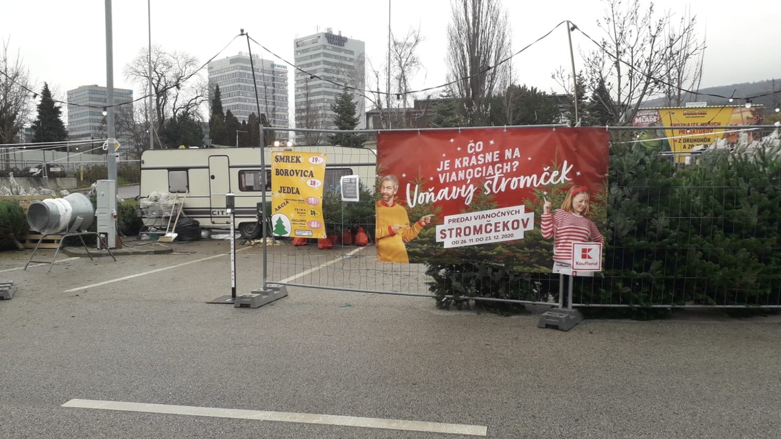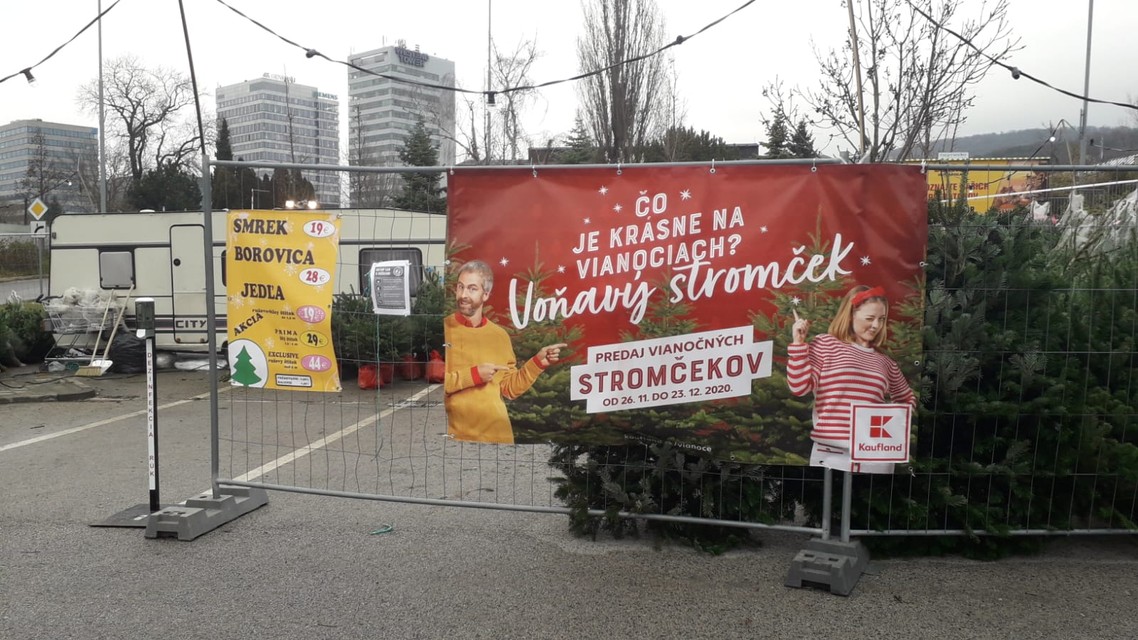 Aj na parkoviskách pri supermarketoch Kaufland sa už začalo s predajom vianočných stromčekoch a dokonca sú na predajných miestach zatiaľ k dispozícii všetky tri na Slovensku obľúbené druhy ihličnanov, teda smrek za 19 eur/meter, borovica 28 eur/meter a jedľa za 19 eur/1 m, pričom ponúkajú ešte aj stromček v zemine za 29 eur alebo exkluzívnu jedličku v cene 44 eur za meter. V čase našej návštevy na dvoch predajných miestach - Trnavskej a Mlynskej doline však ešte nejaký veľký záujem o stromčeky nebol, dokonca sme nevideli ani predávajúceho, teda pravdepodobne bol v prívese, ale nevyšiel von.