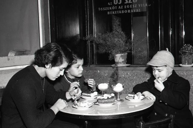 Z interiéru cukrárne zostala zachovaná táto fotografia z roku 1953. Nad návštevníkmi je reklama na denník Új Szó, ktorý začal vychádzať v roku 1948 a v slogane sľubuje čitateľom, že ich spojí s celosvetovým mierovým táborom.