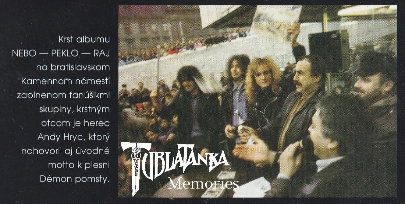 Kamenné námestie sa stalo veľmi dôležitým miestom aj pre skupinu Tublatanka, ktorá sa práve tu v roku 1990 rozhodla pokrstiť svoju platňu Nebo, peklo, raj. "Úvodné slovo ku skladbe Démon pomsty nám vtedy nahovoril herec Andy Hryc, ktorého sme poprosili, aby sa stal krstným otcom tohto nášho albumu. Krst sa konal vonku a prišlo naň veľa ľudí. Nám bolo Kamenné námestie vždy blízke. Náš bubeník Juraj Černý býval v Starom Meste, kam sme za ním často chodievali a pohybovali sme sa práve v tejto lokalite, v ktorej sa nachádzali Malí františkáni, Kryštál bar či iné podniky, kde sme sa po večeroch stretávali," povedal pre Bratislavské noviny spevák Tublatanky Martin Ďurinda.