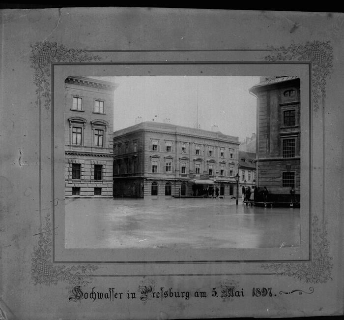 Necelé dva týždne pred slávnostným odhalením Pamätníka Márie Terézie sa vylial Dunaj zo svojho koryta a voda zaplavila priľahlé ulice. Uprostred snímky vidíte bývalý hotel U uhorského kráľa, kde sa na prízemí ešte donedávna nachádzala plzenská reštaurácia Prazdroj, ale na jeseň bola zatvorená a momentálne je celá budova v komplexnej rekonštrukcii. V 19. storočí sem hostí vozili konské koče, čo je zrejmé aj z dobovej fotografie.