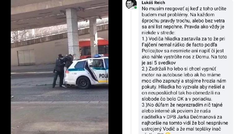 Pod videom zverejneným na sociálnej sieti diskutoval aj kolega zadržaného muža - pán Lukáš Reich, ktorý je od roku 2019 zamestnancom DPB. Ten na FB napísal: "No musím reagovať, aj keď z toho určite budem mať problémy. Na každom šprochu pravdy trochu alebo bez vetra sa ani list nepohne. Pravda ako vždy je niekde v strede: 1.) Vodiča hliadka zastavila za to, že pri fajčení nemal rúško de facto podľa policajtov sa nesmiete ani napiť či jesť akonáhle vystrčíte nos z domu. Na toto je asi 5 svedkov. 2.) Zadržali ho, lebo si chcel vypnúť motor na autobuse, pričom ak ho máme moc dlho zapnutý a stojíme, tak nám hrozia pokuty. Hliadka ho vyzvala, aby nešiel a on neuposlúchol, tak ho obmedzili na slobode, čo bolo OK a v poriadku. 3.) No dúfam, že neprezradím nič tajné alebo interné, ak poviem, že naša riaditeľka v DPB Jarka Dečmanová za najhoršie na tomto vidí, že vodič bol nesprávne ustrojený, lebo mal tepláky. Ináč všetko OK."