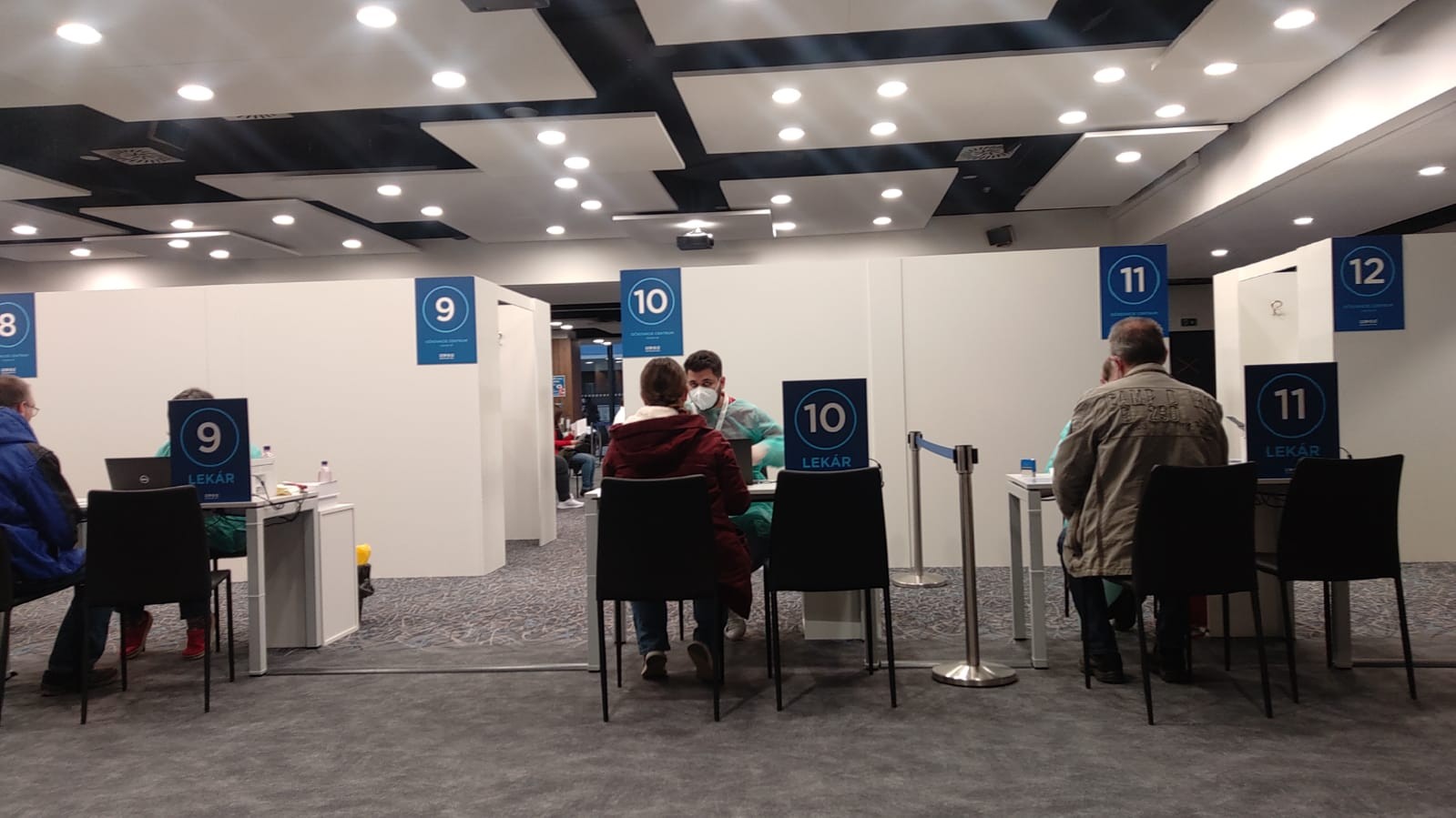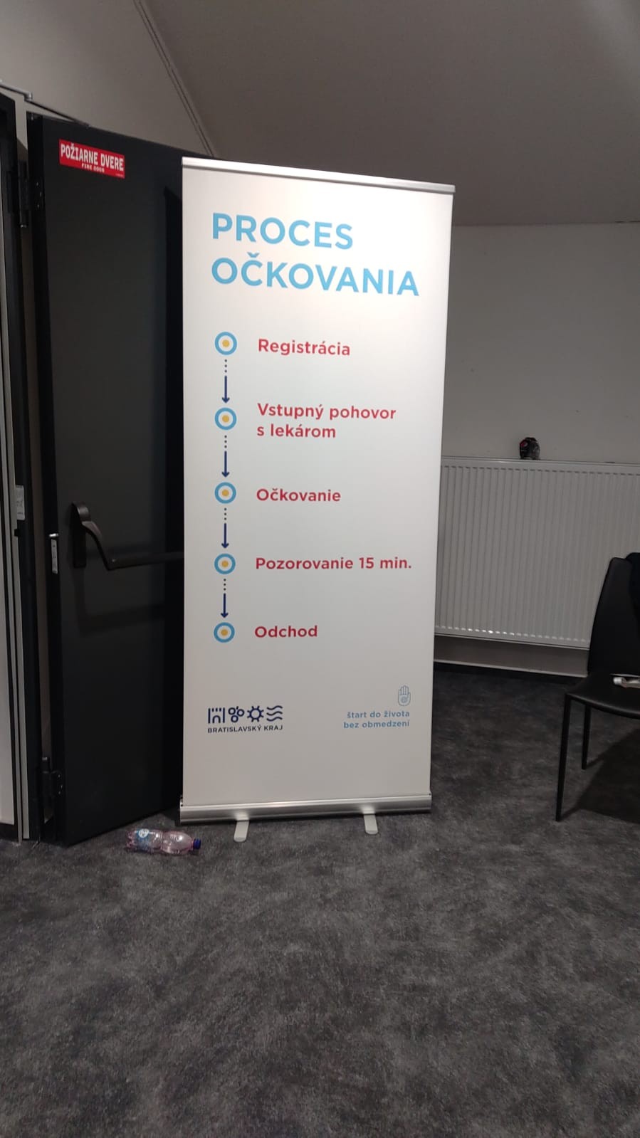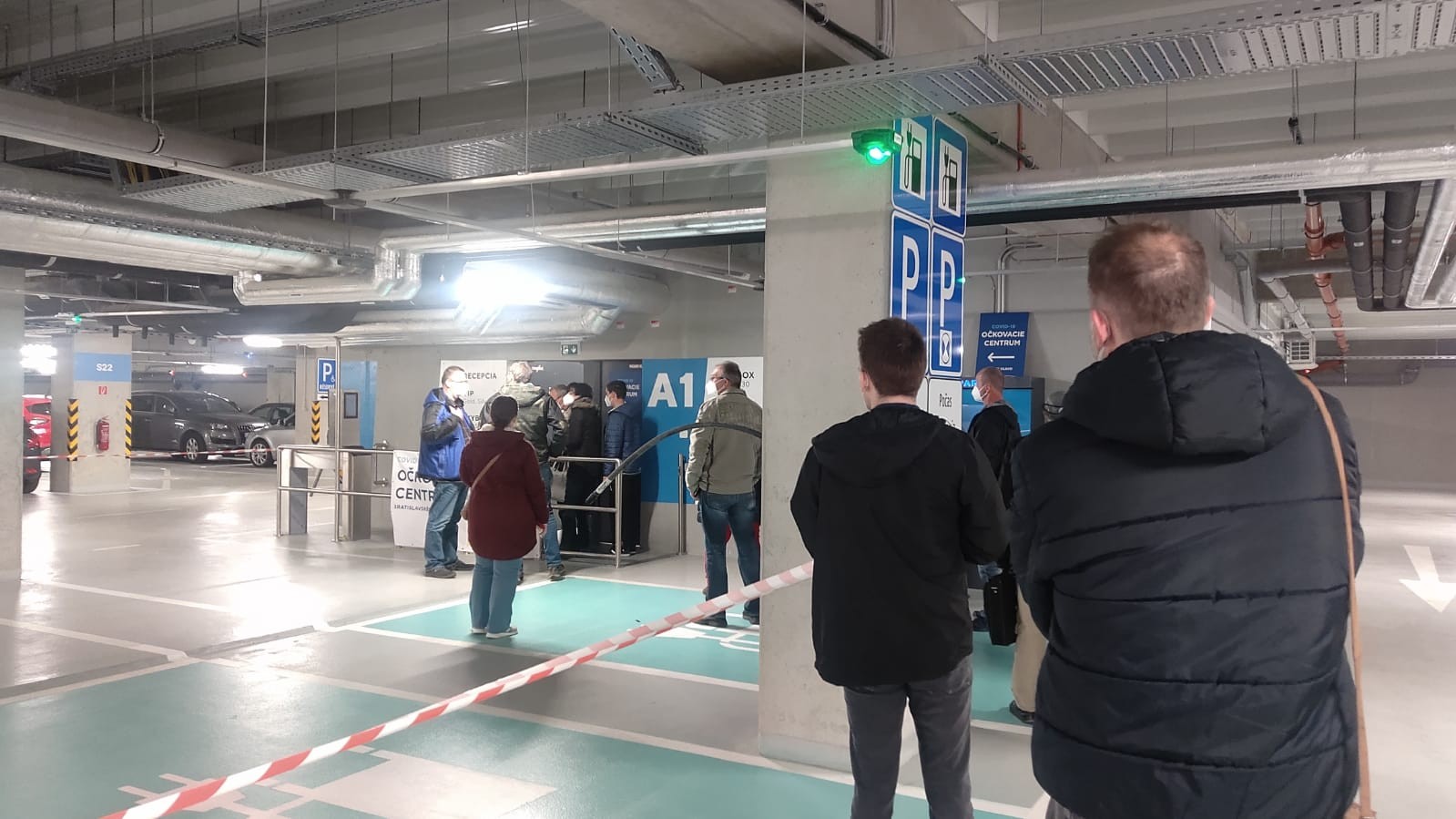 Je približne 15 minút pred termínom očkovania, ale pred vchodom k schodisku, respektíve výťahu sa vytvoril menší rad čakajúcich, ale následne ľudí púšťajú do budovy a potom to ide rýchlo. Napriek tomu, že je piatok večer, tak personál očkovacieho centra je ochotný a všetci sú k návštevníkom veľmi ústretoví a milí.