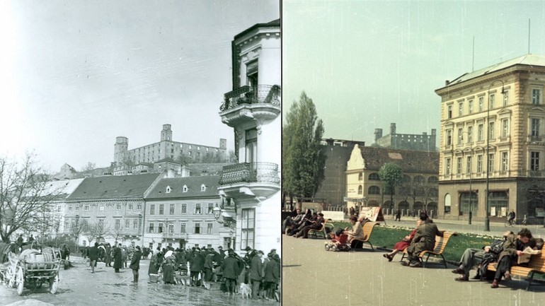 "V tej budove v centre obrázku býval spolužiak. Jeho mama mi prišila rukáv na košeli, ktorý mi v rámci naháňačky na ihrisku, ktoré bolo na ľavom okraji záberu, nechtiac odtrhol. Tú košeľu predo mnou nosili traja bratranci, takže bol zázrak, že ešte držala pohromade," zaspomínal si pri starých fotografiách z Rázusovho nábrežia pán Peter Čáni.
