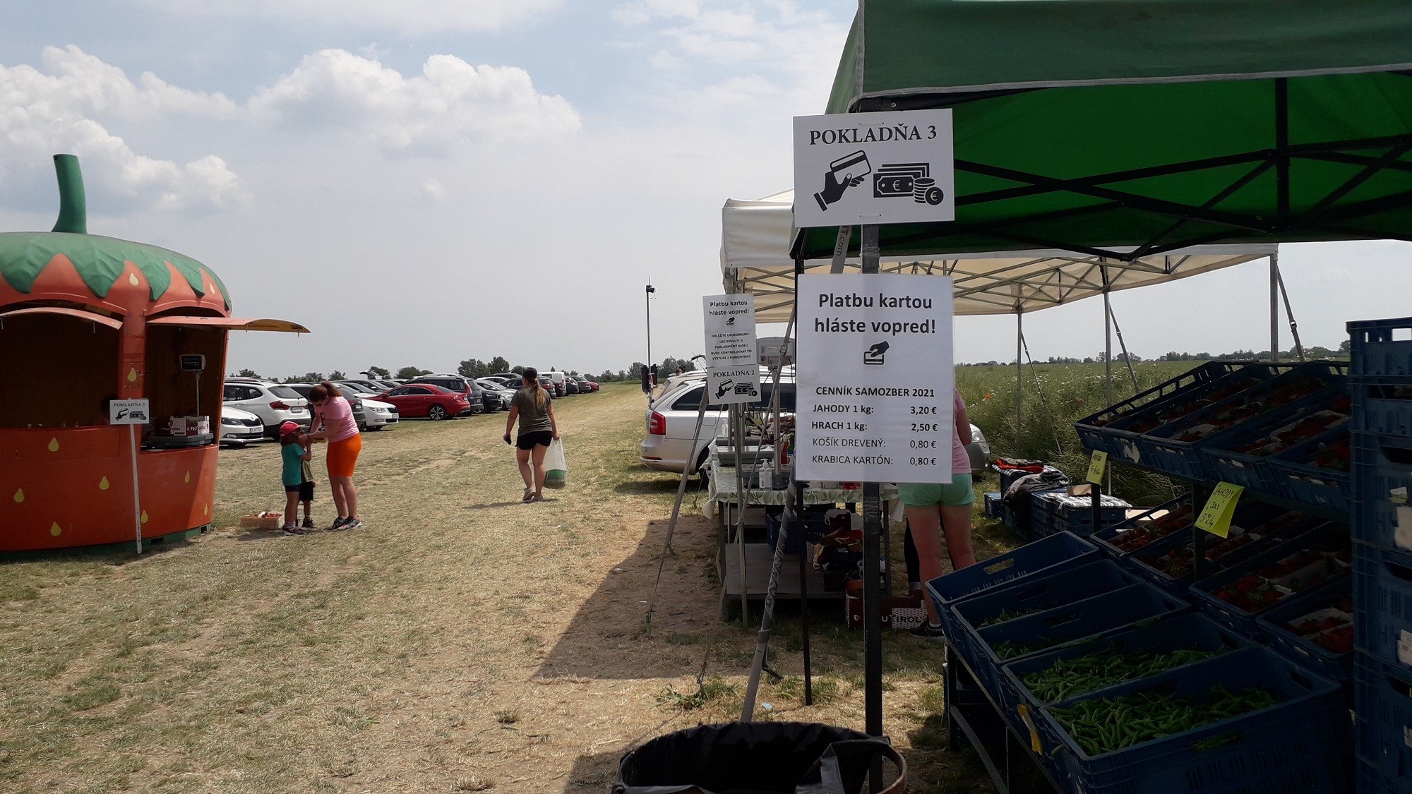 Navigátori tu fungujú spoľahlivo, najskôr vás nasmerujú k voľnému miestu na parkovisku a potom na konkrétne pole – podľa toho, či ste prišli na jahody, alebo na hrach. Provizórna cesta vedúca na parkovisko je dosť prašná, museli sme pozatvárať všetky okná v aute, ale podstatné je, že napriek veľkému počtu vozidiel sme nemali problém zaparkovať.