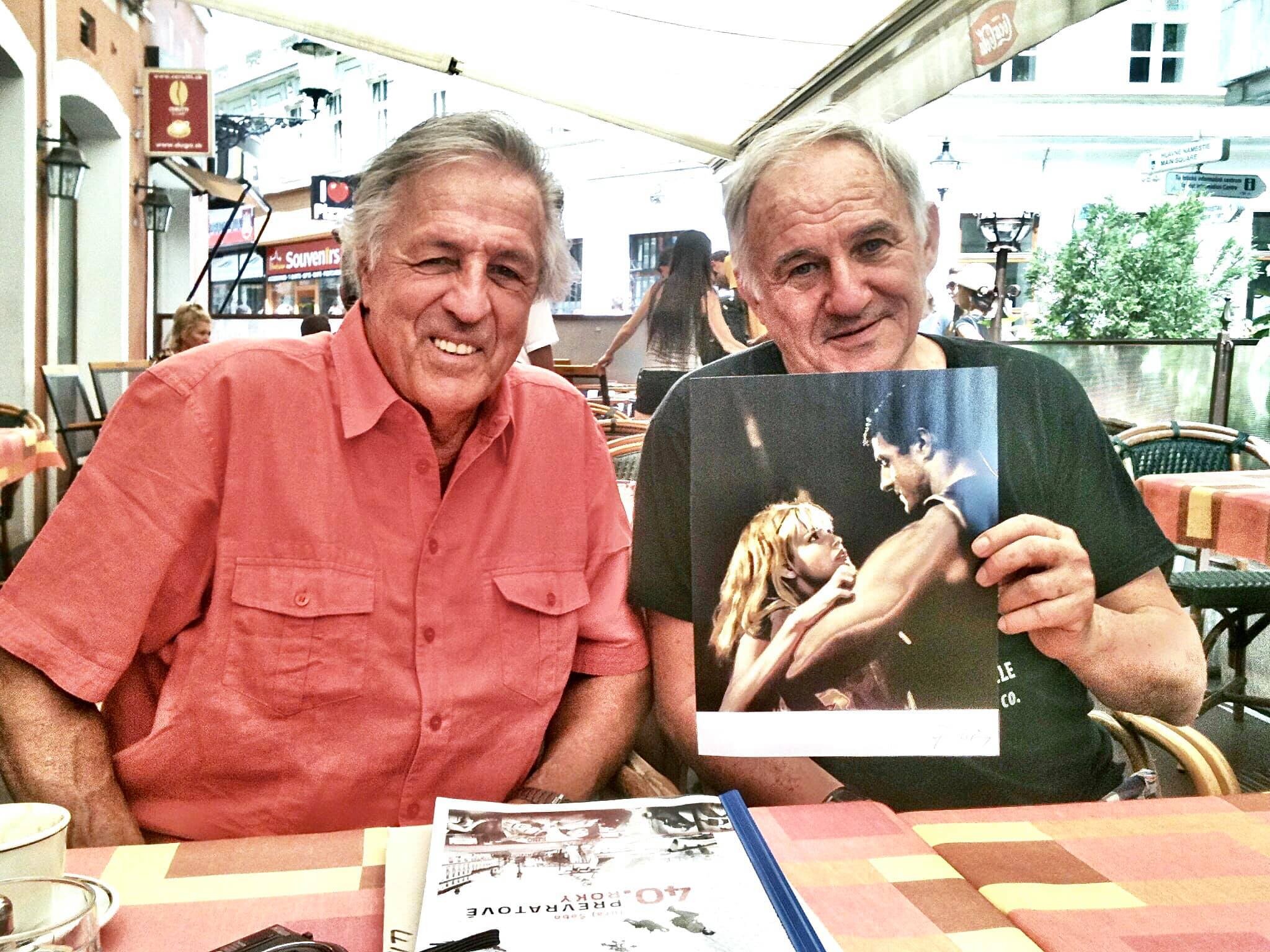 Herec, architekt a kulturista Juraj Višný s dnes už nebohým spisovateľom Jurajom Šebom, ktorý drží v rukách fotografiu z filmu Kto chce zabít Jassie?, kde hrala aj česká sexbomba 60-tych rokov - herečka Oľga Schoberová.