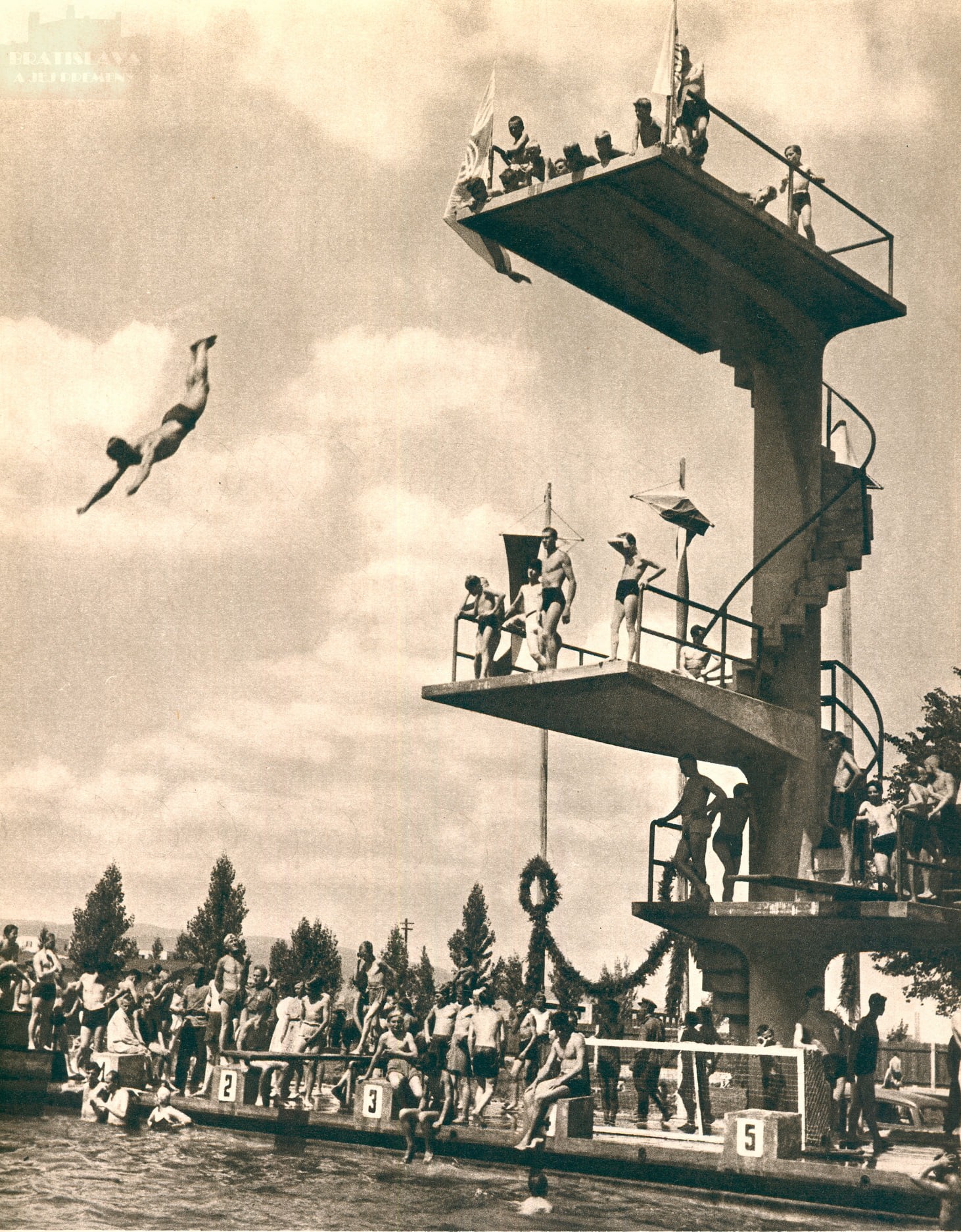 Letné kúpalisko na Tehelnom poli postavili v roku 1940, nakoľko po začiatku druhej svetovej vojny prišla Bratislava o Petržalku, ktorá pripadla nemeckej ríši a s ňou aj o obľúbenú pláž Lido na brehu Dunaja, kam sa obyvatelia nášho mesta radi chodievali v lete kúpať a opaľovať. Určite ste si všimli, že pri veľkom bazéne vtedy bola atrakcia, akú by ste tu už dnes hľadali márne...