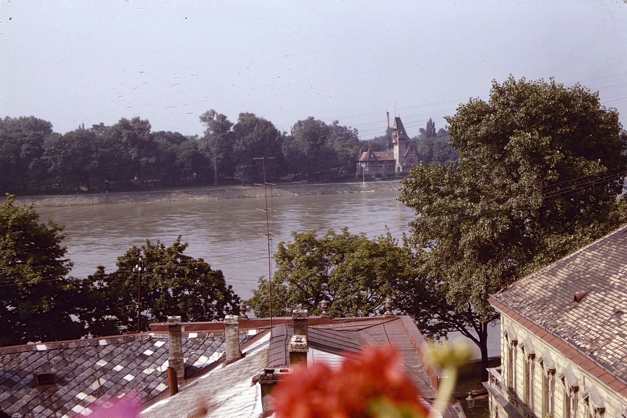 Výhľad na Dunaj a petržalský breh, kde ešte vtedy stál nemecký veslársky klub - pekná budova, ktorá tiež musela ustúpiť výstavbe druhého mosta ponad rieku...