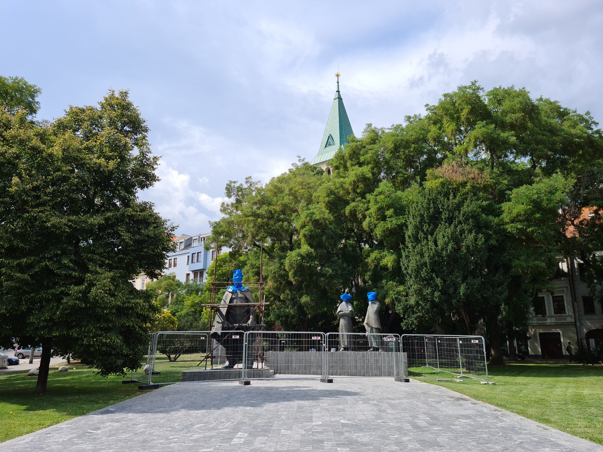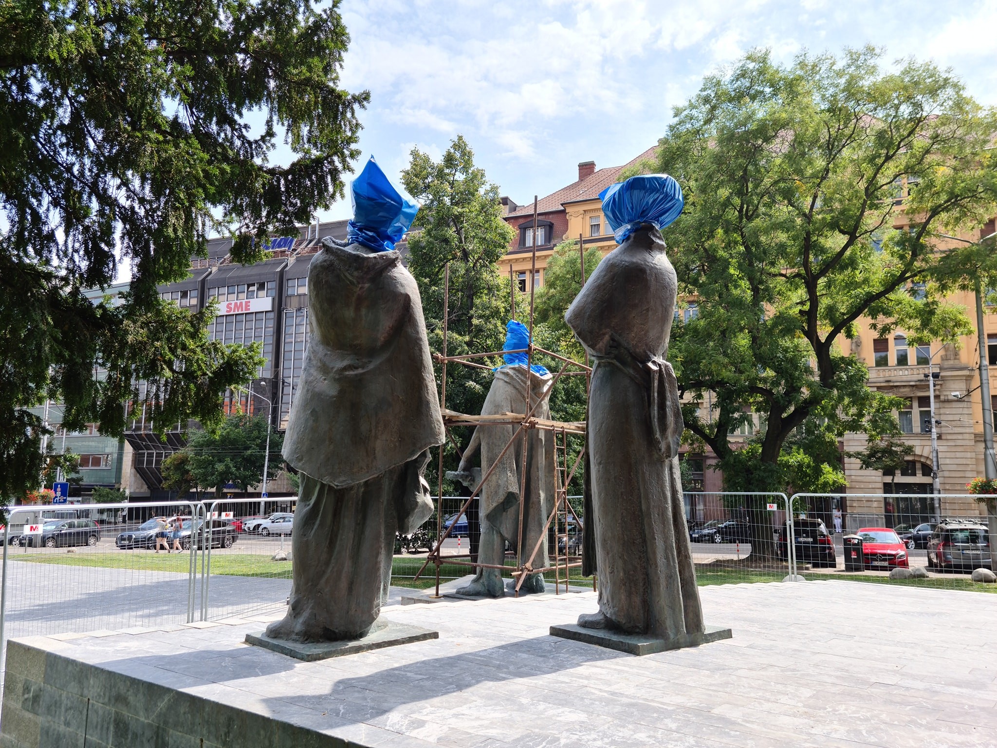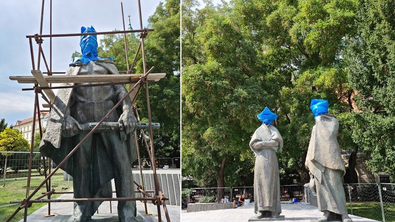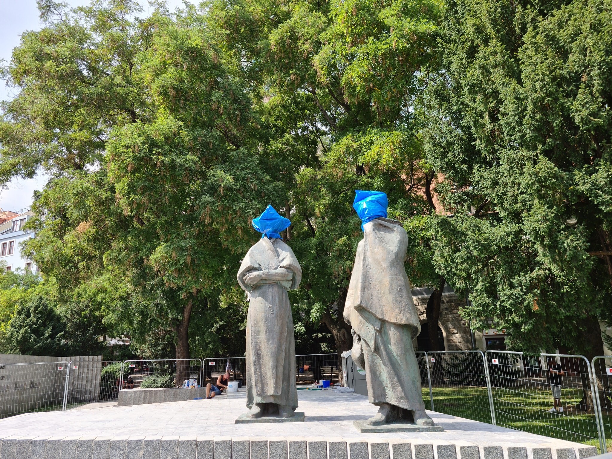 "Stav sôch na Námestí SNP si vyžadoval rekonštrukciu, ktorá bude trvať do utorka 24. augusta 2021. Hlavy sôch sú prekryté z toho dôvodu, že reštaurovanie bronzových sôch si vyžaduje špeciálnu technológiu zábalov pri odstraňovaní uhlíkových krúst aj depozitov a zároveň, aby boli zachované jemné detaily tváre sôch," povedala pre Bratislavské noviny Mgr. Katarína Rajčanová - hovorkyňa hlavného mesta SR Bratislavy.