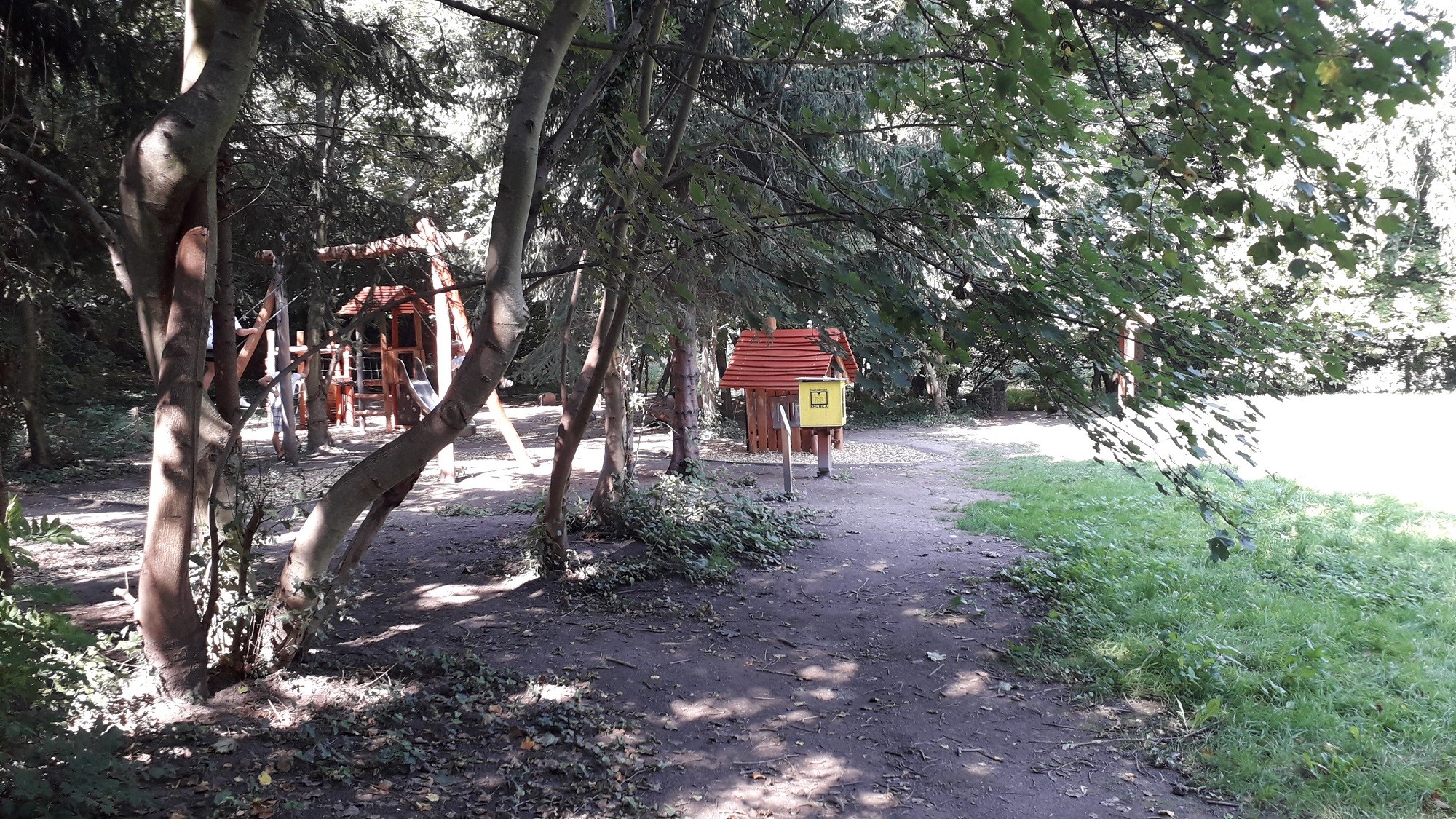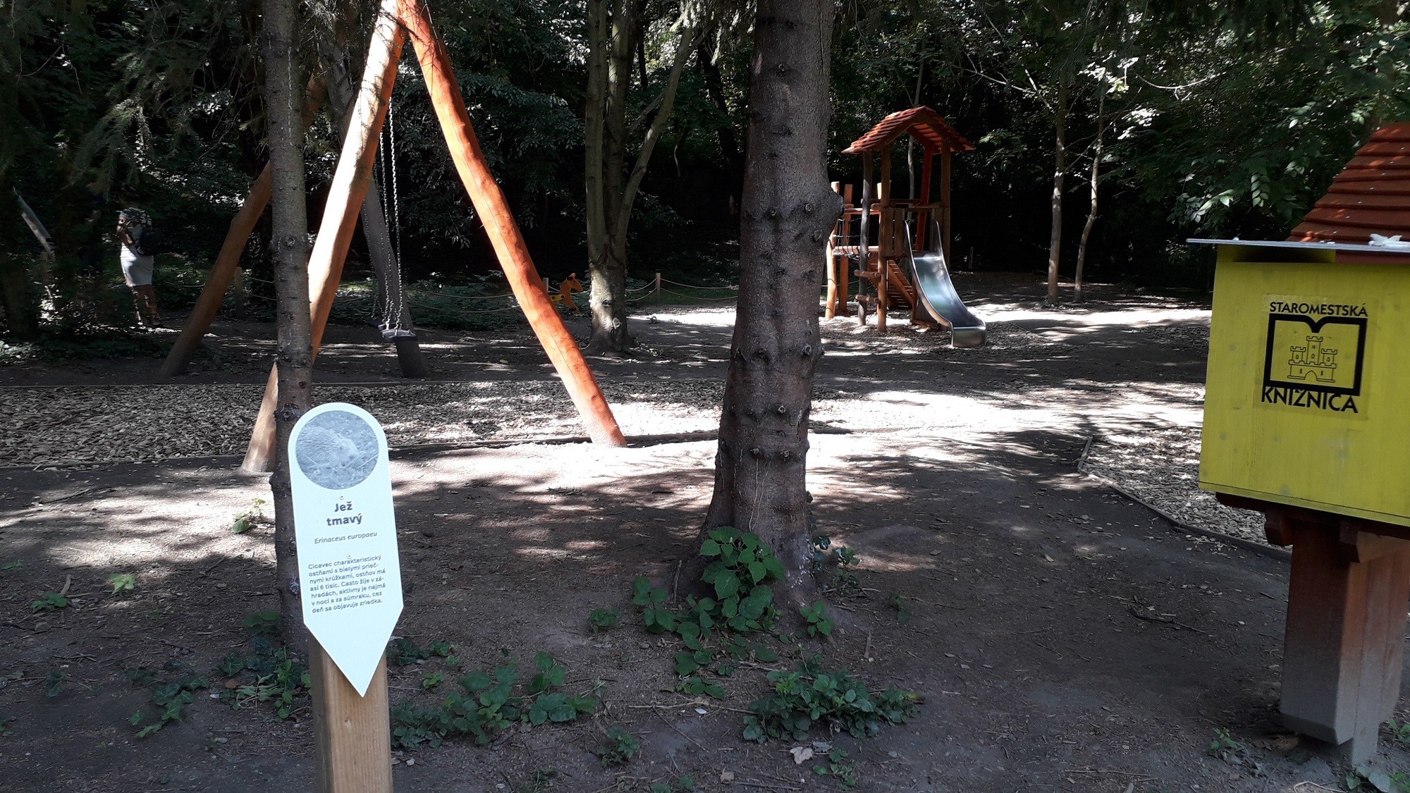 V záhrade nájdete rôzne hracie prvky pre deti, aj informačné tabule o rastlinách a zvieratách, ktoré tam žijú.