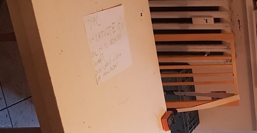 Na papieri je nápis: DPC UPRATUJTE SI. BOL TO TU NECHUTNÝ HUMÁČ. BUDÚ CHODIŤ ĽUDIA NA OBHLIADKY.
