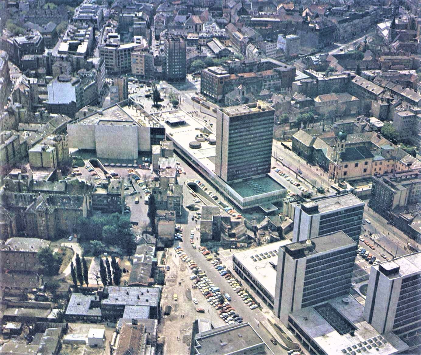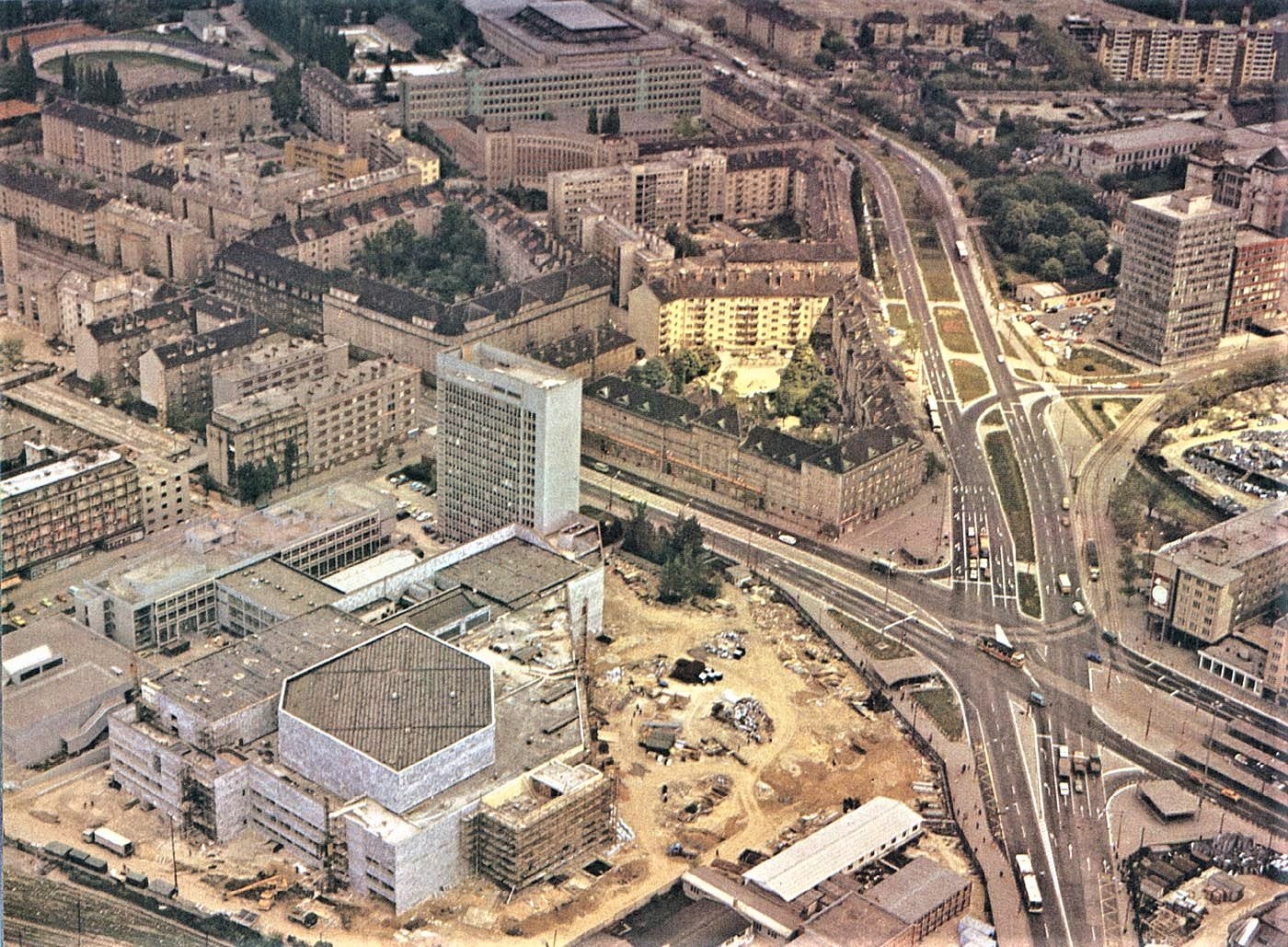 Trnavské mýto bolo vždy rušnou dopravnou križovatkou a dlhé roky sa na ňom nachádzalo aj tzv. Centrálne trhovisko. To však muselo koncom 70-tych rokov ustúpiť výstavbe Domu odborov a Domu techniky, ktorých budovy už dominujú aj nasledujúcej leteckej snímke pochádzajúcej z roku 1980.