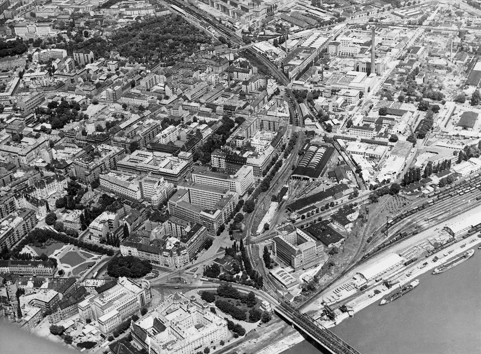 Nasledujúca čiernobiela snímka vytvorená počas preletu nad Dunajom ponúka pohľad na inú časť Starého Mesta, na ktorej môžete dobre vidieť budovu Univerzity Komenského, Šafárikovo námestie s priľahlým parkom či súčasné sídlo Ministerstva vnútra SR, ale oveľa zaujímavejšie pre oko všímavého pozorovateľa by bolo zamerať sa na to, čo tam v súčasnosti už nie je.