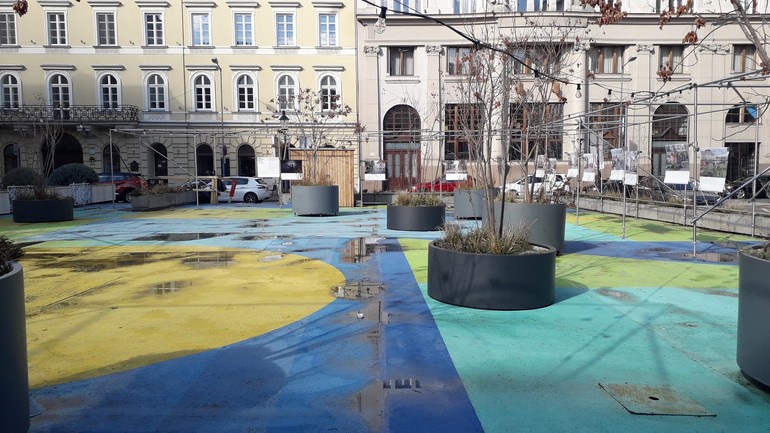 V rámci dočasného riešenia na Komenského námestí pribudla pred dvoma rokmi umelecká maľba, mohli sme si aj posedieť na červených stoličkách pri stoloch z projektu Sadni si!, vznikol tu tiež pavilón pre výstavy. Prvou výstavou v septembri 2020 boli výsledky architektonickej súťaže, kde si záujemcovia pozreli víťazný návrh architektov, ktorí premenia Komenského námestie na atraktívny Komenského parčík. So sľubovanou obnovou sa zatiaľ nezačalo, naopak, námestie pôsobí, akoby sa naň zabudlo.