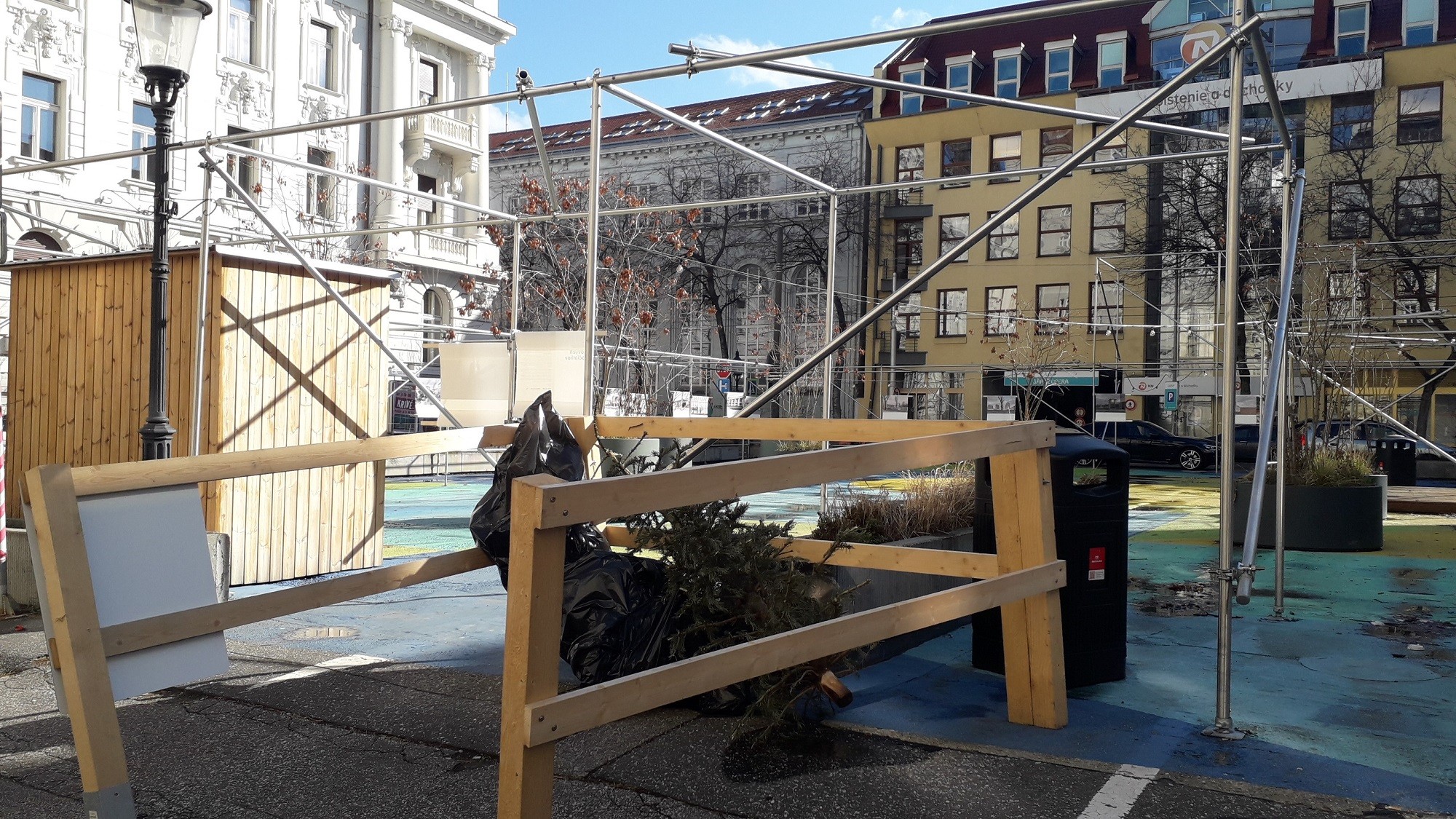 Priamo pred vstupom z Gorkého ulice stále stojí ohrada s pohodeným vianočným stromčekom, pritom posledné stromčeky malo mesto odviezť do kompostárne 11. februára. V okolí vidíme aj porozhadzované prázdne plechovky a v kvetináčoch vyschnuté rastliny, potešia len zábery na "Mesto nových začiatkov" - projekt spomínanej talentovanej fotografky Jany Šantavej. Podľa informácie magistrátu však pozitívne zmeny na námestí prídu už čoskoro.