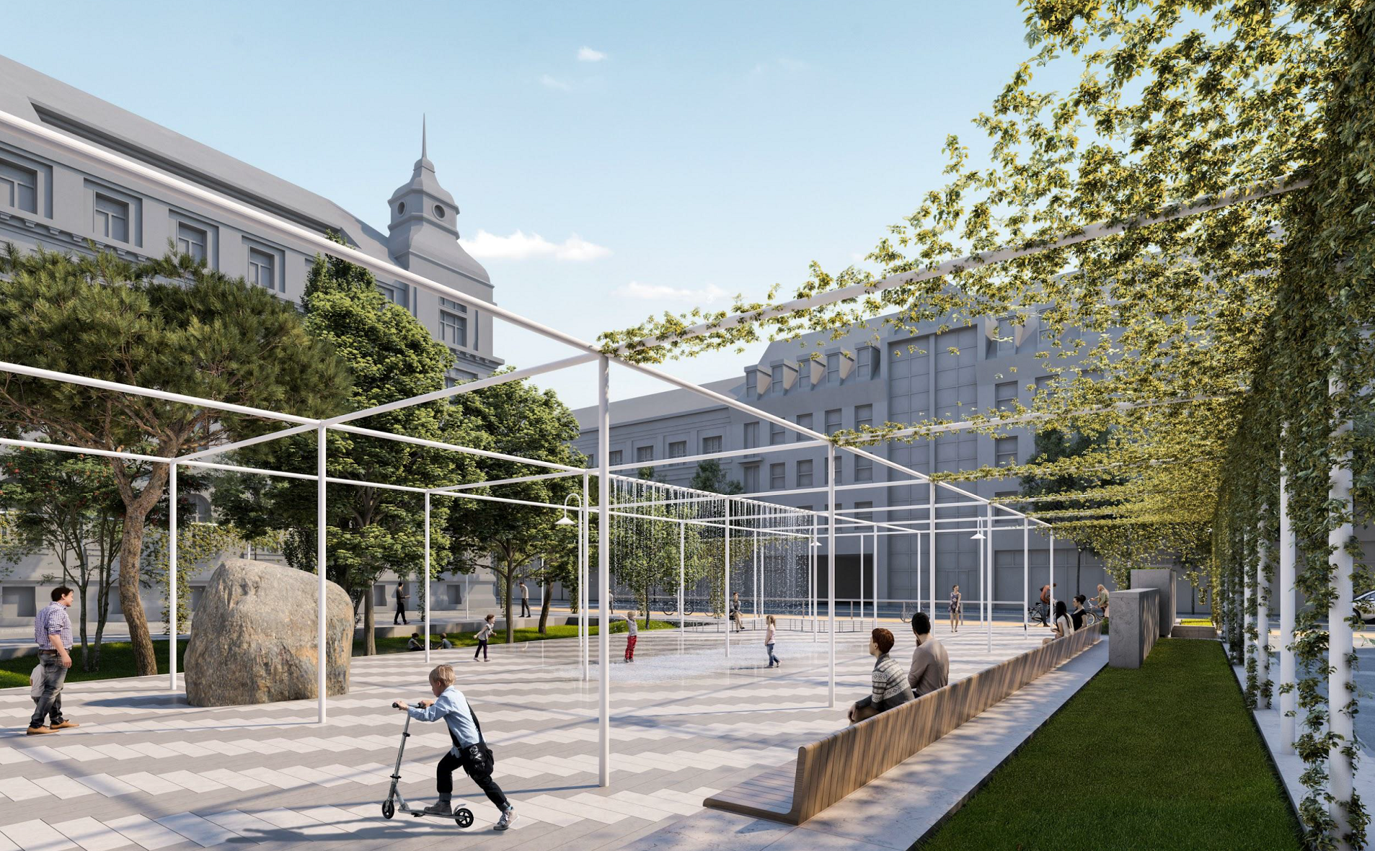 Návrh víťazného ateliéru Totalstudio delí námestie na dve časti, s jednou zníženou pod úroveň okolia. Okrem popínavej zelene vytvárajúcej tieň nad priestorovou mriežkou prináša na časť námestia bez podzemných priestorov vzrastlé stromy. Povrch navrhli tak, aby privádzal dažďovú vodu do tej časti námestia, kde budú rastliny a kde bude môcť vsiaknuť.