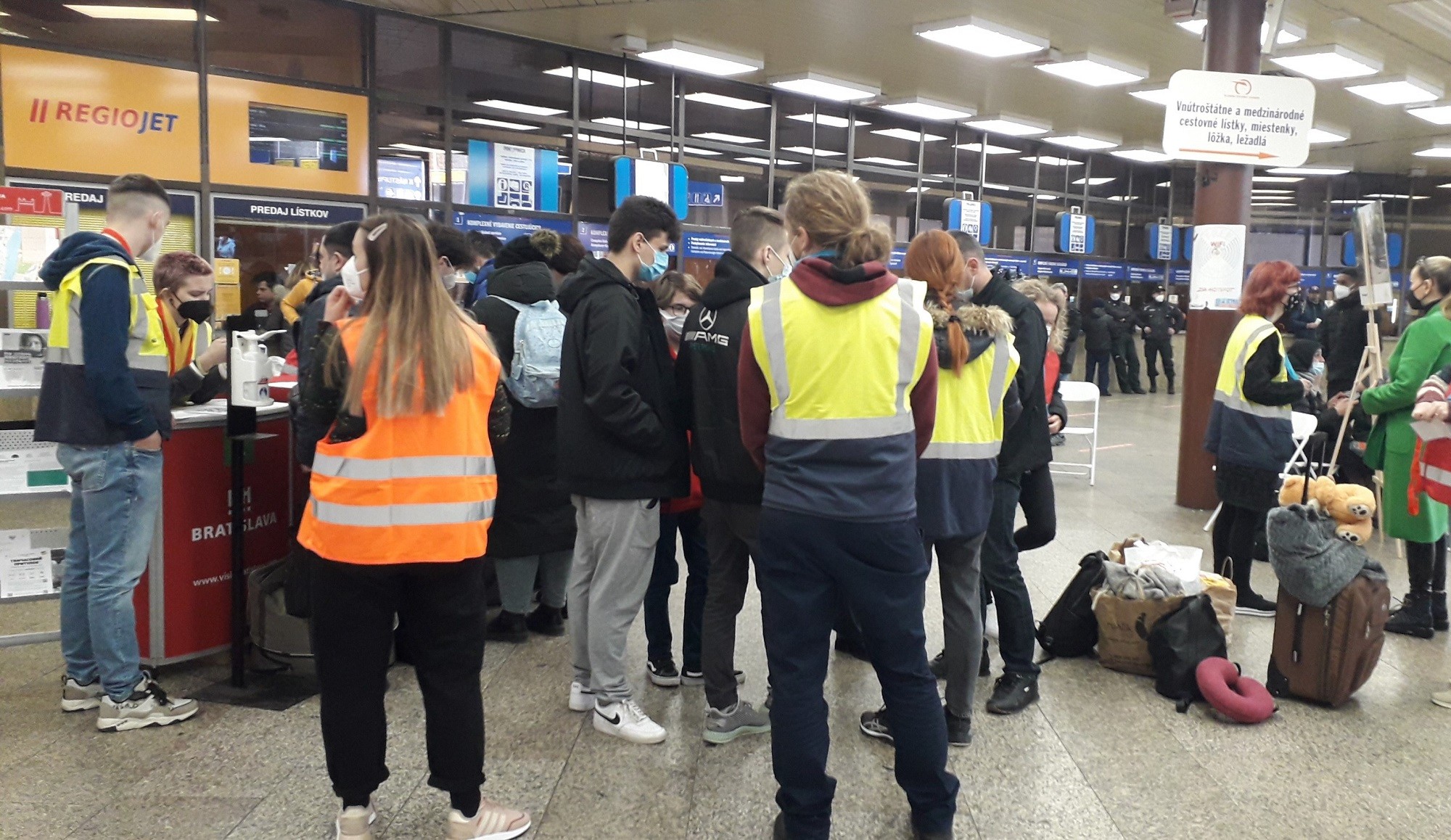 Ľuďom utekajúcim z Ukrajiny pomáhajú dobrovoľníci aj na bratislavskej Hlavnej stanici.
