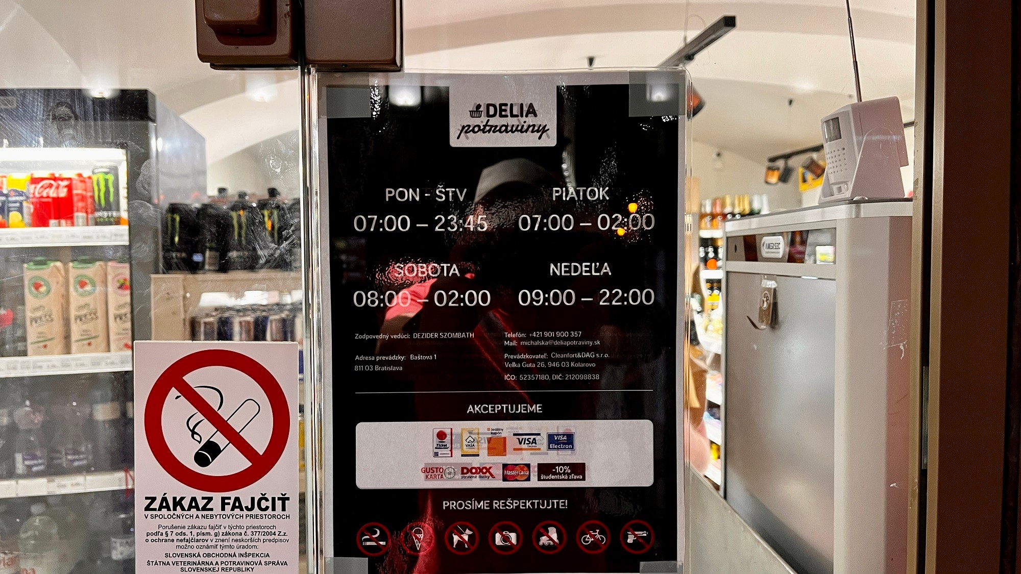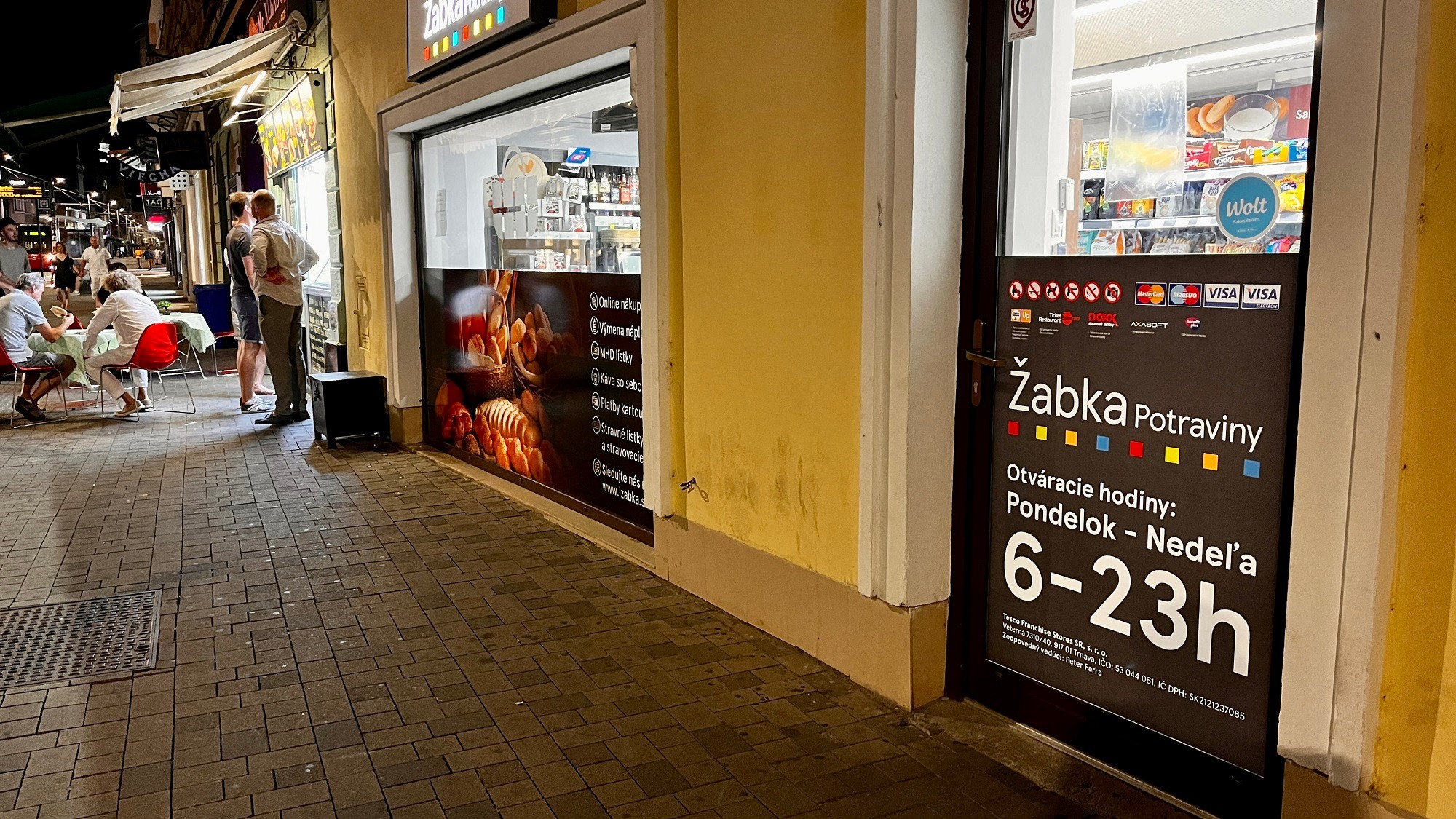 Jednou zo svetlých výnimiek na Obchodnej boli potraviny Žabka, tie mali zatvorené, s výrazným oznamom o otváracích hodinách od 6.00 h do 23.00 h. Prekvapila dokonca Delia pod Michalskou bránou, ktorá tiež pri vstupe do predajne bez okolkov priznáva, že predáva dlhšie ako umožňuje VZN: v pondelok až štvrtok do 23.45 h, v piatok a sobotu dokonca až do 2.00 h.