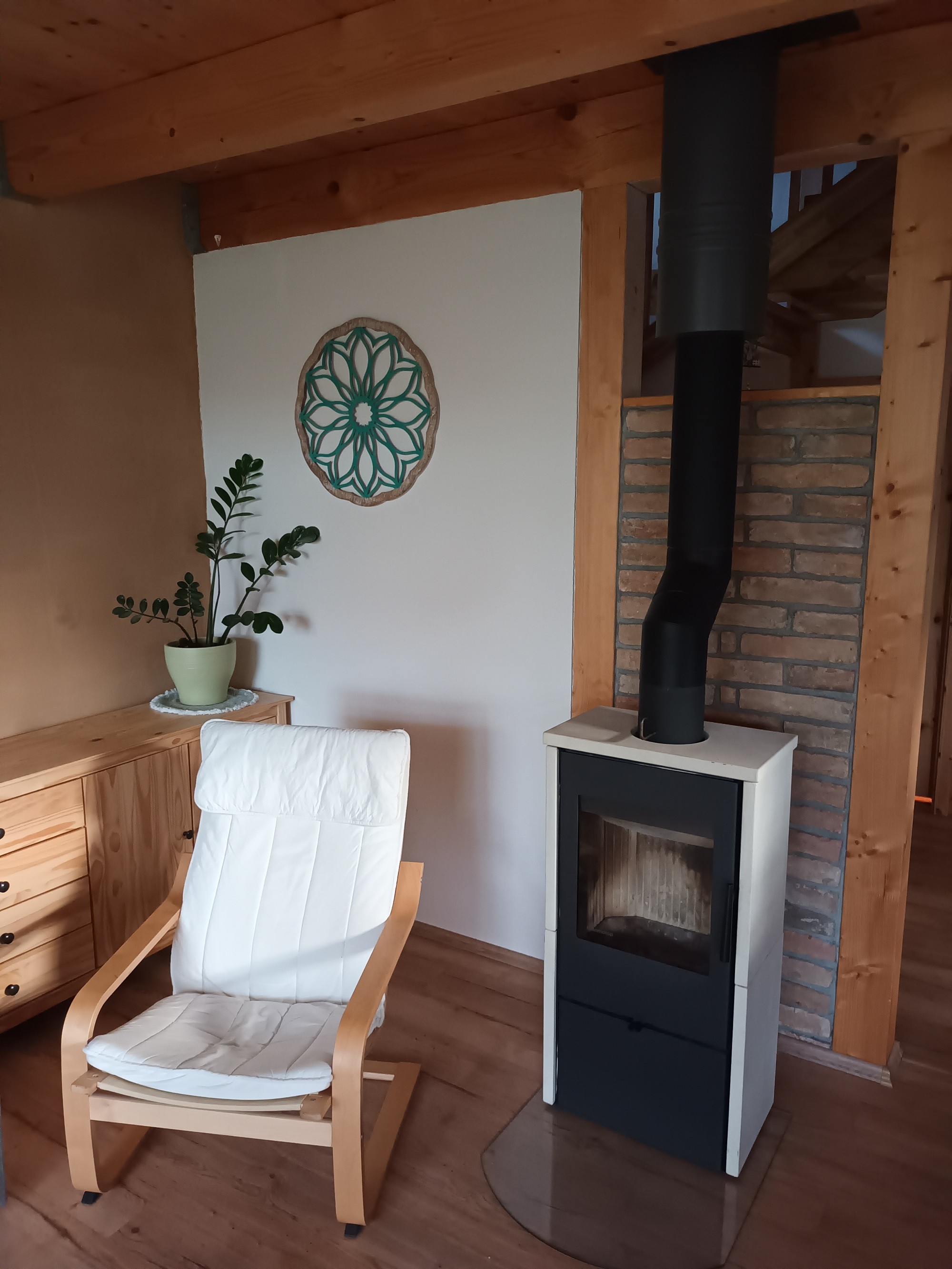 Keďže dom má minimálnu tepelnú stratu, mohli si dovoliť vykurovať ho elektricky infrapanelmi, celá investícia do hlavného zdroja stála menej ako dvetisíc eur. V dome majú navyše krbové kachle na drevo, tie im po zdražení energií urobia dobrú službu. „Drevo na kúrenie máme zatiaľ všetko zo starých chorých ovocných stromov, takže na túto a asi aj budúcu zimu nemusíme kupovať žiadne. To naše bude akurát správne vysušené. Doteraz sme krbové kachle používali len občas, ale túto zimu asi budeme viac kúriť drevom,“ pokračuje Patrik Martin.
