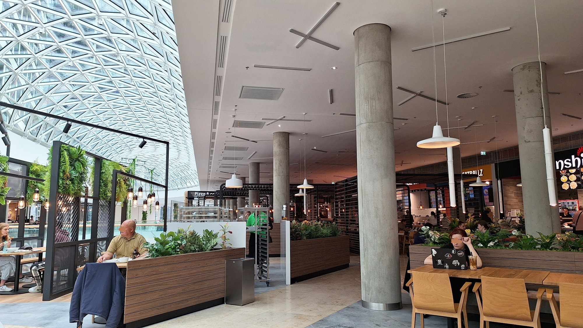 Zašli sme sem v posledný pracovný deň pred víkendom okolo obeda a mali sme pocit, že ľudí láka viac ako nákupy v obchodoch. Priestor foodcourtu je veľký a otvorený, oplatí sa pozrieť i hore, pohľad na mrakodrap cez presklenú stropnú konštrukciu je fascinujúci. Hoci záujemcov o fastfoodové špecialitky postupne pribúdalo, nebol problém nájsť si voľné sedenie, a to nielen na jedenie, v hale môžete aj relaxovať pri dobrej káve alebo si vytiahnuť notebook a vybaviť niečo pracovné.