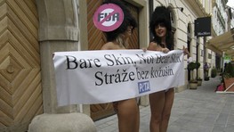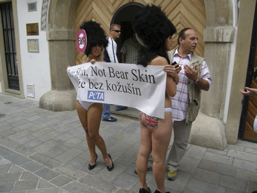 Britky, ktorých prsia zahaľoval transparent "Bare skin, not bare skin. Stráže bez kožušín", vyzvali Slovákov, aby podporili ich kampaň a napísali britskému ministrovi obrany, že "používanie týchto čiapok v 21. storočí je nespravodlivé a kruté".