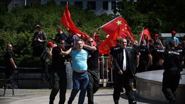 Na námestí pokračujú slovné potýčky medzi vítajúcimi čínskeho prezidenta a aktivistami, ktorí prišli upozorniť na ľudské práva v Číne. Vítajúci prezidenta sa neustále pokúšajú znemožniť aktivistom, aby ich transparenty bolo vidieť, ľudí pretláčajú vlastnými transparentmi alebo sa snažia ich transparenty stiahnuť dole. Policajti sa snažia skupiny od seba oddeľovať.
