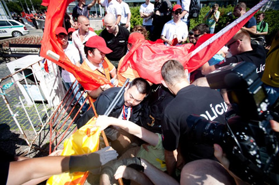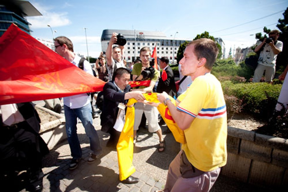 Zaujímavým spôsobom sa snažia prívrženci čínskeho prezidenta Chu Ťin-tchaa, ktorí ho prišli privítať pred Prezidentský palác na Hodžovom námestí, prekryť transparenty aktivistov, protestujúcich proti porušovaniu ľudských práv v Číne. Prezidentovi priaznivci majú transparent v angličtine - Vítame prezidenta Hu!, ktorým sa snažia prekryť transparent Slobodu pre Čínu!, ktorý držia aktivisti.