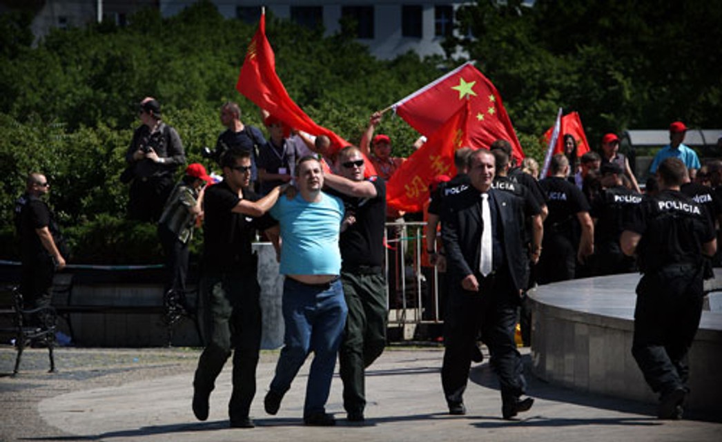 AKTUALIZÁCIA (18.6.2009, 19:00): Ako informoval František Peczár z oddelenia komunikácie a prevencie Krajského riaditeľstva Policajného zboru SR v Bratislave, v súvislosti s nepovoleným zhromaždením na Hodžovom námestí musela zasahovať bratislavská polícia voči narušiteľom verejného poriadku. Na mieste dochádzalo k stretu medzi dvoma skupinami ľudí (teda prívržencov prezidenta Čínskej ľudovej republiky a jeho odporcov), preto bol policajný zákrok oprávnený. Bol použitý na obnovenie verejného poriadku. Polícia na tomto mieste zadržala a následne predviedla na policajné oddelenie 9 osôb. Šiesti z nich boli občania Slovenskej republiky a zvyšný traja boli občanmi Čínskej ľudovej republiky.