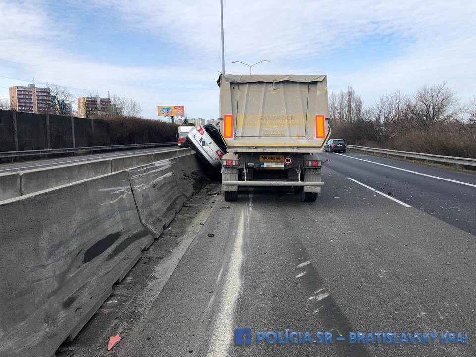 AKTUALIZOVANÉ Na diaľnici D2 pri zjazde do bratislavskej Dúbravky došlo dnes k naozaj hrozivo vyzerajúcej nehode. Nákladiak pritlačil osobné auto o betónové zvodidlá.