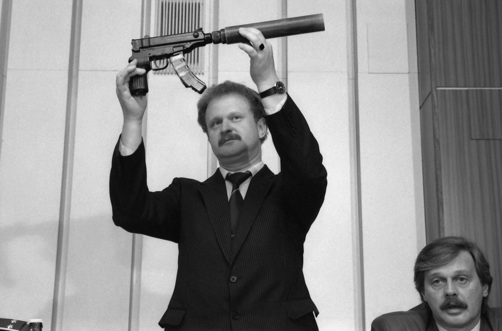 Hlavný vyšetrovateľ prípadu Vladimír Kotulič ukazuje smrtiacu zbraň páchateľov (na úvodnej foto detail zbrane):