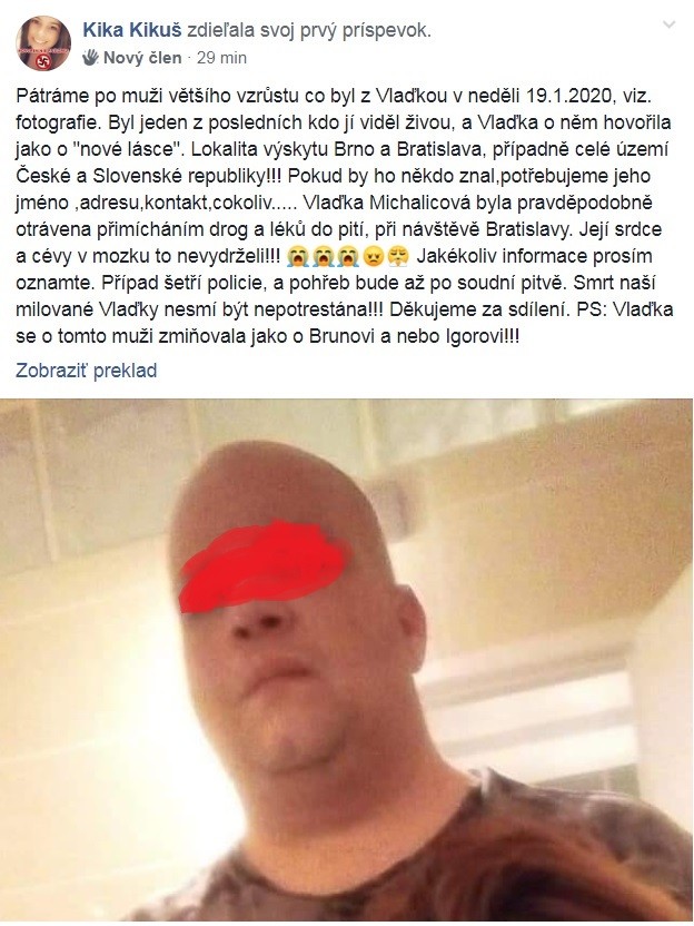 Na sociálnej sieti sa tento týždeň objavila výzva kamarátky výzva nebohej Češky, ktorá na sociálnej sieti používa nick Kika a tá vo svojom statuse tvrdí, že Vlaďka bola v Bratislave pravdepodobne otrávená primiešaním liekov alebo drog do pitia, čo jej cievy a mozog nevydržali a napokon zomrela. Zároveň zverejnila fotografiu muža, ktorý mal s nebohou Vladimírou naposledy byť a to 19. januára. Chcela ho prostredníctvom Facebooku vypátrať a opýtať sa ho, čo sa jej priateľke mohlo stať.