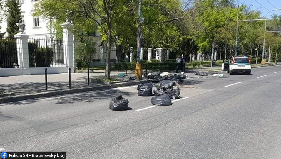 Polícia SR z Bratislavského kraja na svojom oficiálnom facebookovom profile zverejnila dve fotografie spred Úradu vlády SR, kde bolo na chodníku ako aj cestnej komunikácii pohádzaných niekoľko čiernych igelitových vriec s odpadom...