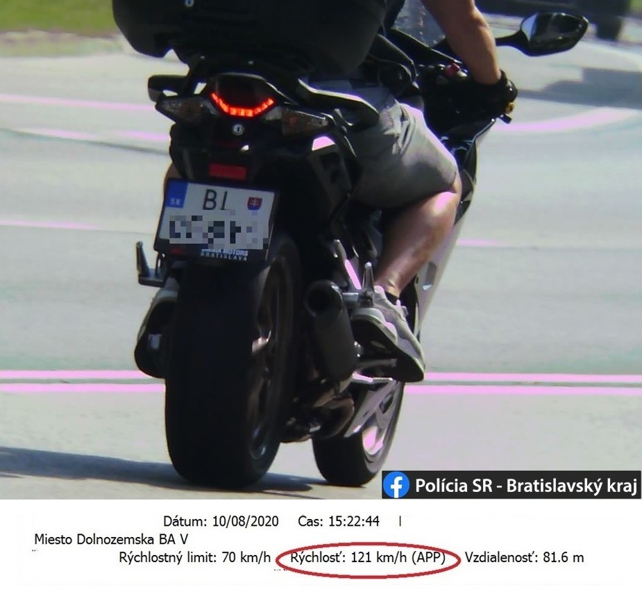"Na Dolnozemskej ceste, kde je najvyššia dovolená rýchlosť 70 km/h, prechádzal motorkár rýchlosťou 121 km/h! Za takéto konanie hrozí vodičovi motocykla pokuta vo výške 471,- eur," napísali policajti z Bratislavského kraja na sociálnej sieti.