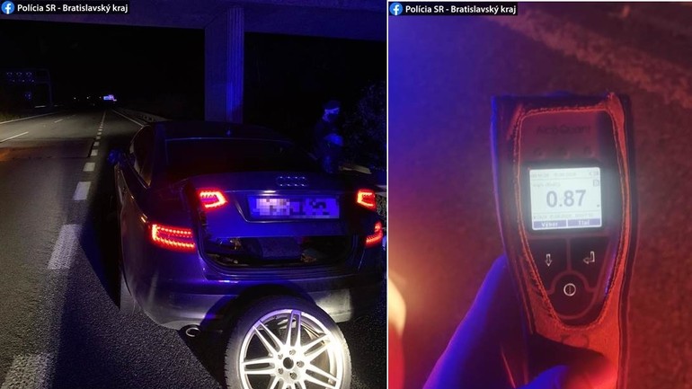 "Policajti Pohotovostnej motorizovanej jednotky po vozidle začali po vozidle pátrať, pričom uvedené vozidlo spozorovali odstavené vo výjazdovom pruhu z jednej z čerpacích staníc na diaľnici D2. Jeho vodič sa pohyboval bez reflexnej vesty v pravom jazdnom pruhu diaľnice a vymieňal koleso na uvedenom vozidle. Z dôvodu bezpečnosti vodiča, ako aj iných účastníkov cestnej premávky sa policajti s ním presunuli za zvodidlá. Vodič, 47-ročný cudzí štátny príslušník javil viditeľné známky požitia alkoholu, a z tohto dôvodu ho policajti podrobili dychovej skúške. Tou mu bolo nameraných 0,87 mg/l čo predstavuje 1,81 promile. Na miesto sa dostavila patrola NDS ktorá uvedené vozidlo označila ako prekážku v cestnej premávke," informuje polícia z Bratislavského kraja na sociálnej sieti.