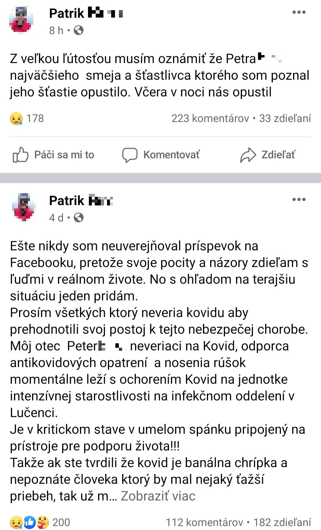 "Do správ ste nám poslali status muža, v ktorom píše, že jeho otec, ktorý bol na protestoch v Bratislave, kde veľa ľudí nemalo rúško, sa dostal do nemocnice, kde mu zistili koronavírus. Podľa statusu ležal na jednotke intenzívnej starostlivosti na infekčnom oddelení v Lučenci. Bol v kritickom stave v umelom spánku pripojený na prístroje. Včera v noci zomrel. Áno, ide o reálny profil reálneho človeka a áno, zomrel mu otec, ktorý zomrieť nemusel a mohol ešte dlhé roky žiť," uviedla na sociálnej sieti polícia.