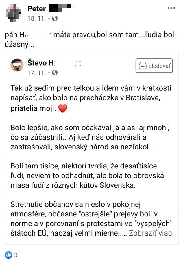 Takto sa dnes už zosnulý Peter vyjadril k statusu iného muža, ktorý sa zúčastnil na protestoch.