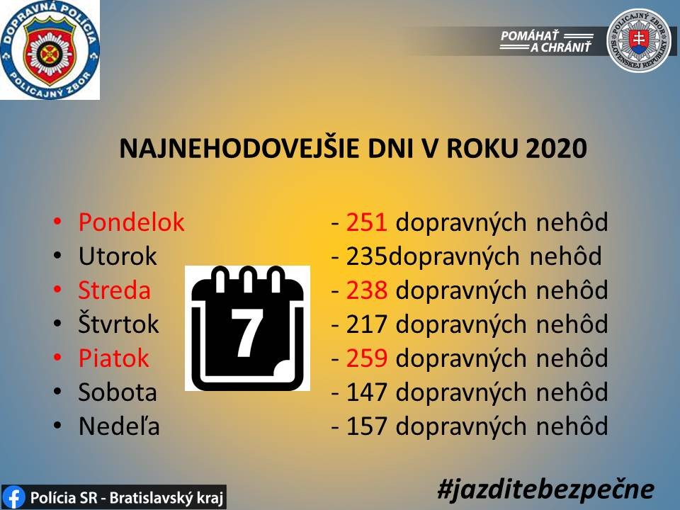 Dopravní policajti vyhodnotili dopravné nehody na území Bratislavského kraja počas minulého roka a zistili, ktoré dni v týždni sú najnehodovejšie a naopak.
