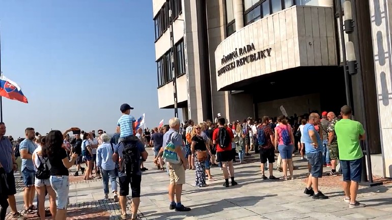 Pred parlamentom od piatka (23. 7.) rána protestovali stovky ľudí proti opatreniam v súvislosti s pandémiou nového koronavírusu a proti novele, podľa ktorej by sa malo pri tvorbe opatrení prihliadať na digitálny COVID preukaz, a teda tých, ktorí sú zaočkovaní či negatívne testovaní.