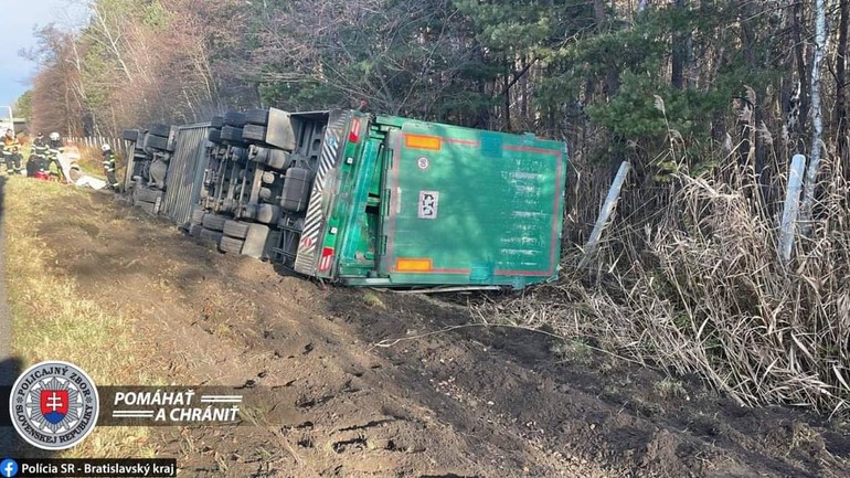 "Vodič nákladného motorového vozidla prevážajúceho ošípané, pravdepodobne z dôvodu mikrospánku zišiel s vozidlom mimo vozovky, kde došlo k jeho prevráteniu . V súvislosti s nehodou došlo k zraneniu dvoch osôb vo vozidle, na miesto sa presúvajú zamestnanci Štátnej veterinárnej správy, " informovali policajti na sociálnej sieti.