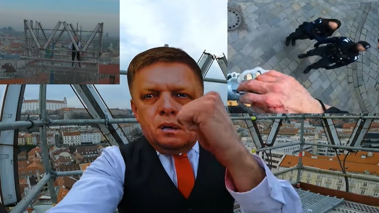 Na YouTube kanáli užívateľa s nickom Peter the Great sa tento týždeň objavil zostrih z výstupu 26-ročného muža, ktorý v maske politika Roberta Fica vyliezol v stredu bez povolenia po lešení až na vrchol Michalskej veže. A treba uznať, že výhľad mal odtiaľ na Bratislavu naozaj úchvatný...