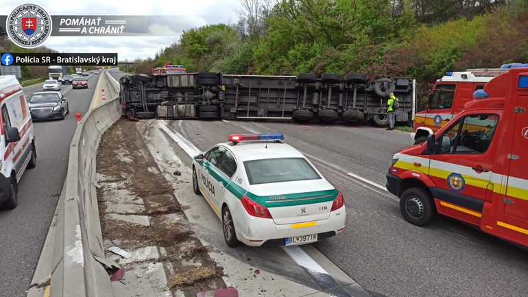 Nehoda: Na diaľnici medzi Trnavou a Bratislavou sa prevrátil kamión